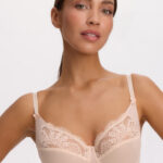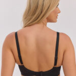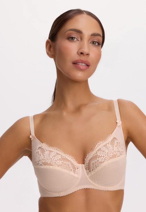 Бюстгальтер 002 выполнен на косточках, чашки мягкие, шитые из неэластичной ткани и широкого кружева с цветочным рисунком и ресничками, с боковым подкроем, нижняя часть чашек с внешней стороны покрыта сеткой в крапинку, спинка из стабилизирующей сетки. Бретельки не отстгиваются, регулируются по длине, на спине застжка - удлинитель на крючках, фурнитура металлическая крашеная.002 Fancy M бюст