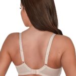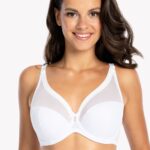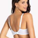 Бюстгальтер 1058 выполнен на косточках, чашки шитые, удлиненные до бретельки, нижняя часть на тонком поролоне, внутренняя сторона прошита хлопковым трикотажем, внешняя и верхняя часть чашки из тонкого полосатого трикотажа, спинка из стабилизирующей сетки. Приподнятый срез нижней чашки закрывает сосок, середина бюстгальтера средней высоты, плотно прилегает к грудине, эластичный трикотаж и широкая резинка плотно собирают грудь и придают ей круглую форму. Бретельки не отстгиваются, регулируются по длине, на спине застжка - удлинитель на крючках, фурнитура металлическая крашеная. Отлично сочетается с трусами 1058 .1058 Sonia PU бюст