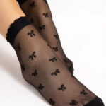 Эластичные носки плотностью 15 den с крошечными бантами и с оборками. Состав: Телесный + розовый: 85% полиамид, 10% эластан, 5% пролен Черный: 90% полиамид, 10% эластан