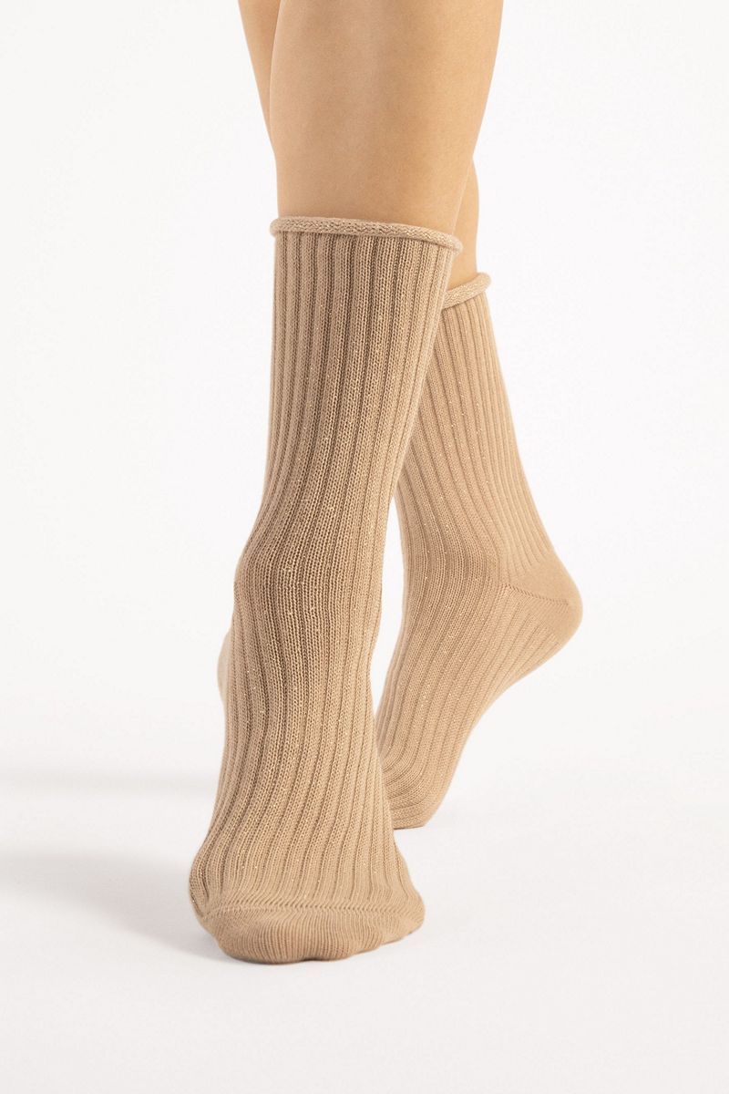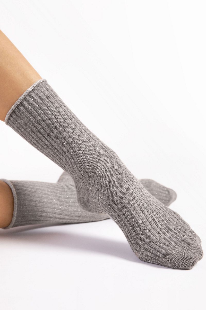Женские хлопковые носки с ребристой текстурой и серебряной люрексовой нитью, которая придает блеск каждому вашему шагу. Рант без давления обеспечивает комфорт в течение всего дня. Хлопковый трикотаж облегает ноги и создает тепловой комфорт. Подходят как для повседневной носки, так и в качестве элегантного аксессуара. Высокое качество изготовления.