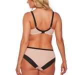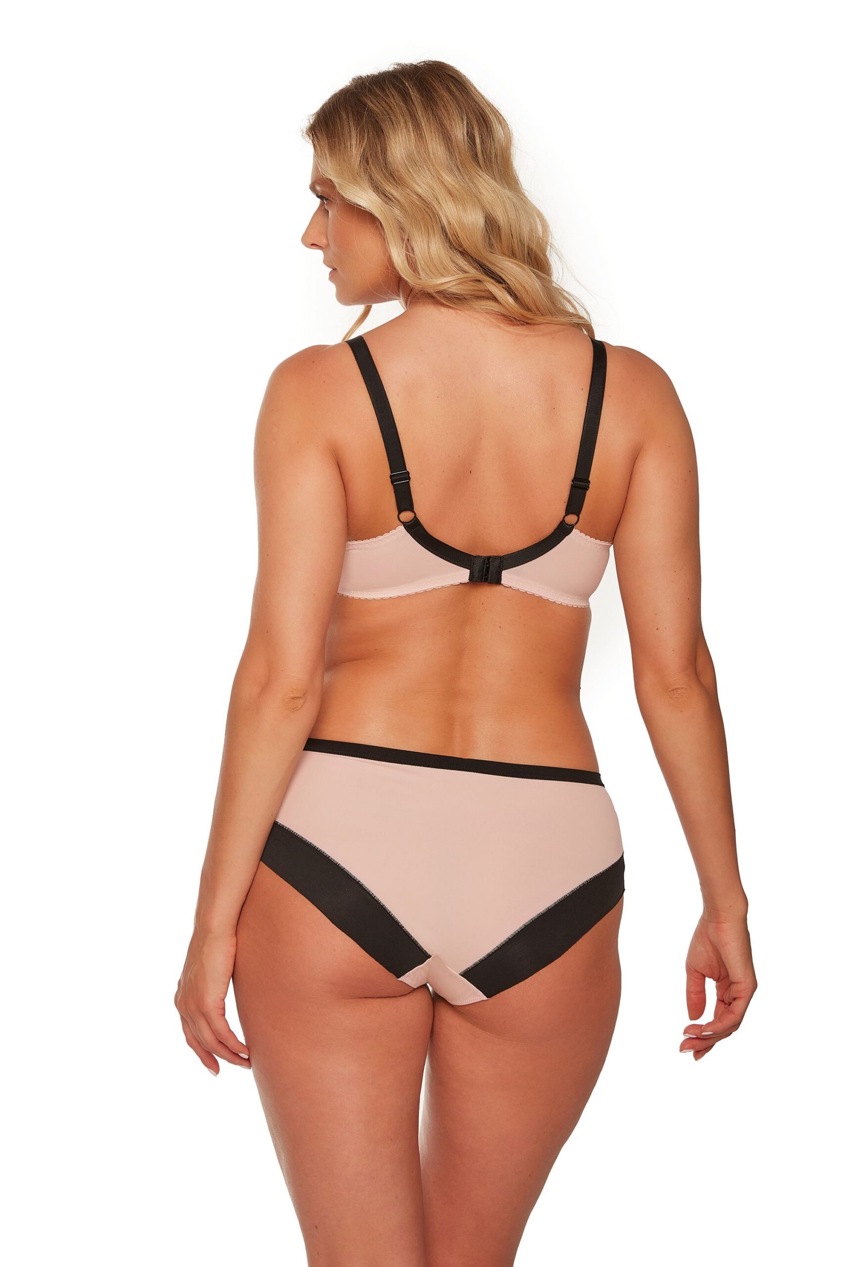 Бюстгальтер 1240 выполнен на косточках, чашки шитые, нижняя часть на тонком светло-розовом поролоне, внутренняя сторона прошита хлопковым трикотажем, верхняя часть чашки из сетки, внешняя часть из сетки с вышивкой бежевой нитью, спинка из микрофибры, в зоне декольте дополнительные тонкие съемные бретели. Бретельки черные, не отстгиваются, регулируются по длине, на спине застжка - удлинитель на крючках, фурнитура металлическая крашеная. Бюст сочетается с трусами 1240 .1240 Leonia PU бюст