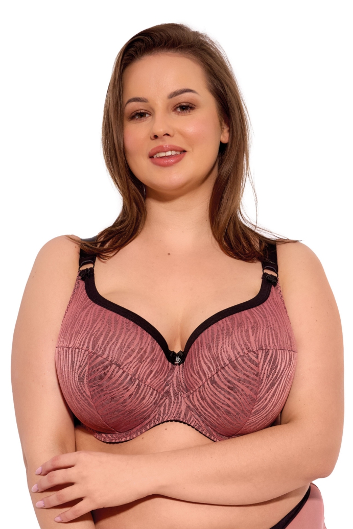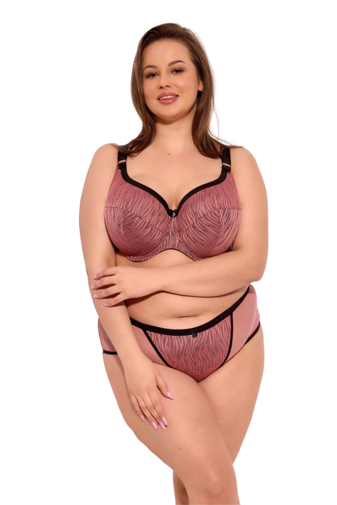 Бюстгальтер 1259 выполнен на косточках, чашки шитые, удлиненные до бретельки, нижняя часть на тонком поролоне черного цвета, внутренняя сторона прошита хлопковым трикотажем, внешняя и верхняя часть чашки, спинка из сетки с анималистическим рисунком, спинка продублирована черной сеткой. Приподнятый срез нижней чашки закрывает сосок, середина бюстгальтера средней высоты, плотно прилегает к грудине, эластичный трикотаж и широкая резинка плотно собирают грудь и придают ей круглую форму. Бретельки контрастного черного цвета не отстгиваются, регулируются по длине, на спине застжка - удлинитель на крючках, фурнитура металлическая крашеная. Отлично сочетается с трусами 1259 .1259 Lise PU Maxi бюст