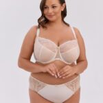 Бюстгальтер 1361 выполнен в цвете экрю-бежевый на косточках, с дополнительными боковыми поддержками, чашки мягкие, шитые из сетки цвета экрю, покрыты светло-бежевом кружевом, нижняя часть чашек продублирована сеткой цвета экрю, спинка из микрофибры цвета экрю. Бретельки не отстгиваются, регулируются по длине, на спине застжка - удлинитель на крючках, фурнитура металлическая цвета желтого золота. Бюст сочетается с трусами 1361 .1361 Celina M Maxi бюст