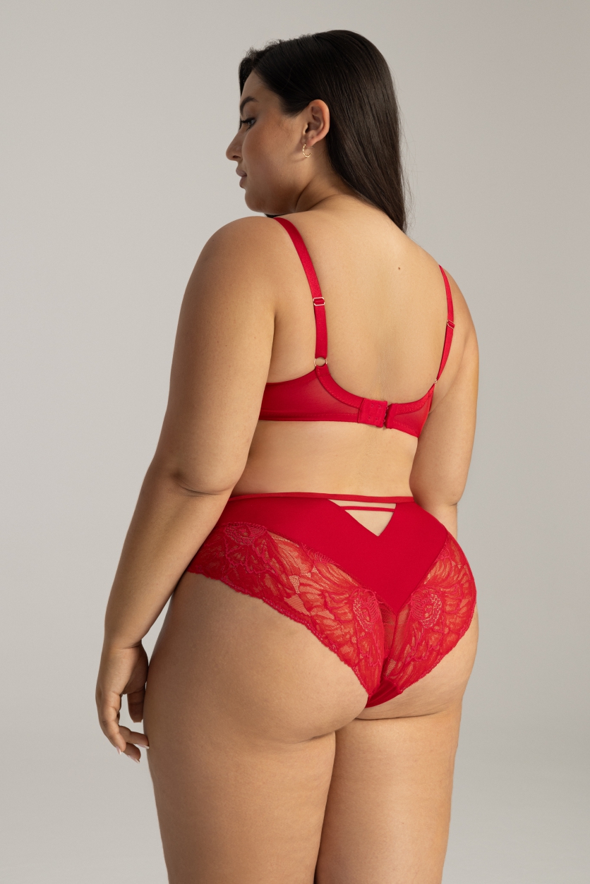 Бюстгальтер 1824/1 выполнен в цвете Барбадосская вишня на косточках, чашки мягкие, шитые из сетки телесного цвета и кружева, не сшитыми между собой, с боковым подкроем, между чашек металлическое украшение с кристаллами, спинка из стабилизирующей сетки, бретельки не отстгиваются, регулируются по длине. На спине застжка на удлинитель на 2 или 3 крючка. В зоне декольте декоративные тонкие стрэпы, регулируемые по длине, фурнитура металлическая цвета меди. Бюстгальтер идеально сочетается с трусиками арт. 1824/1. - обещание пламенного романа!1824/1 M бюст (красн)