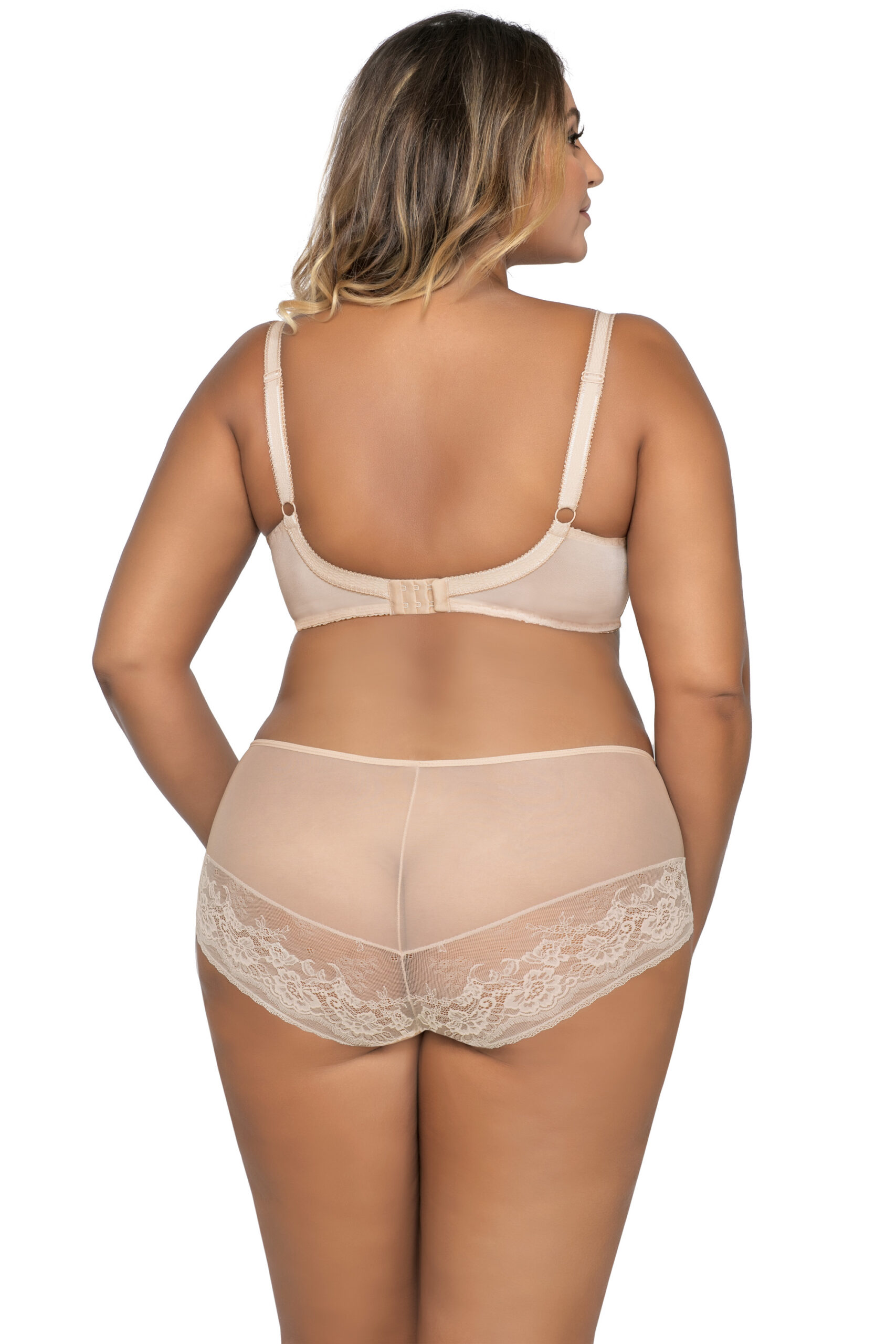 Бюстгальтер 1824 выполнен на косточках, чашки мягкие, шитые из сетки и кружева телесного цвета, бретельки не отстгиваются, регулируются по длине. На спине застжка на удлинитель, количество крючков в ряду застжки увеличивается пропорционально размеру бюстгальтера. Бюстгальтер идеально сочетается с трусиками арт. 1824