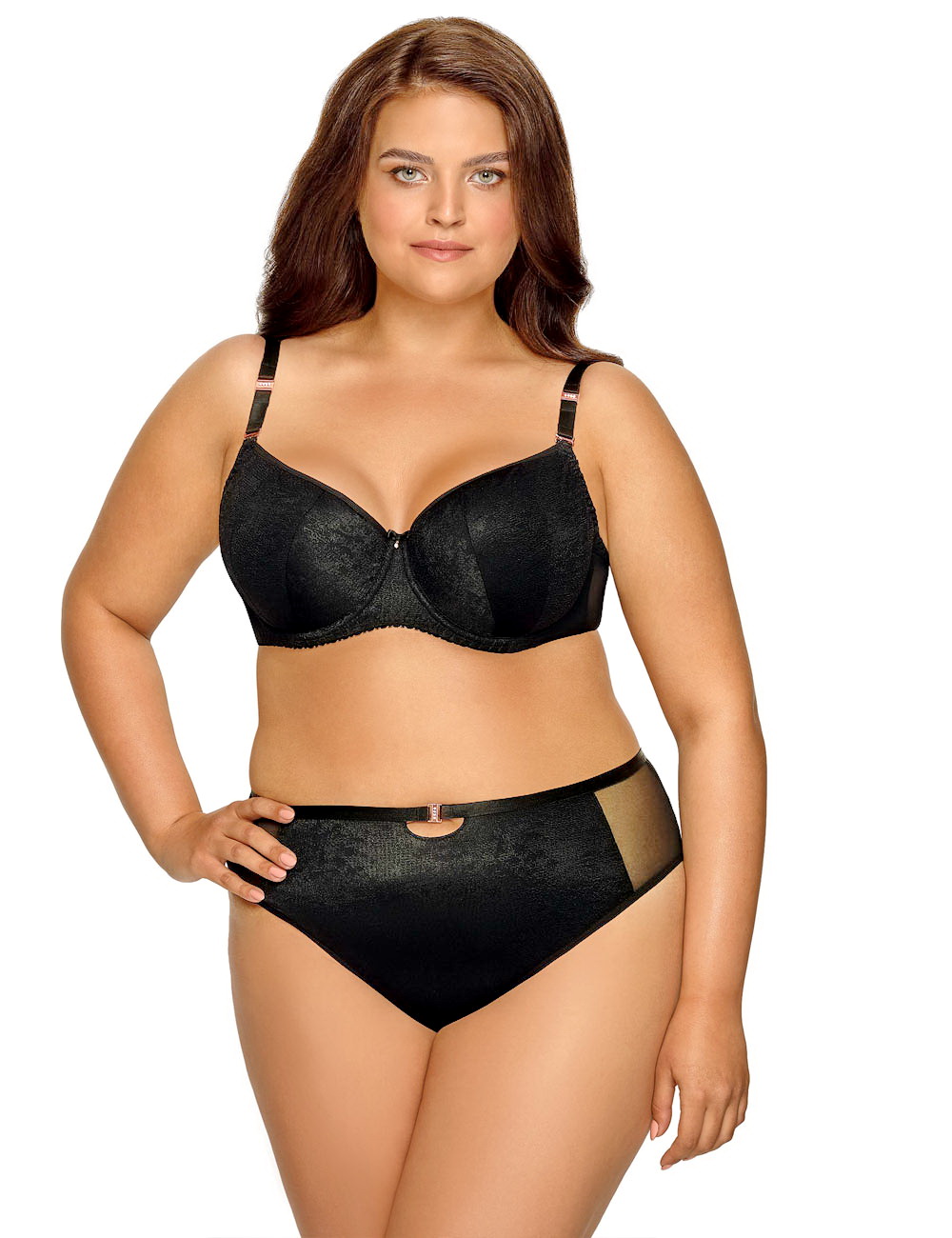 Трусики слип 1931 спереди эластичной ткани, по бокам вставки из сетки, спинка из ткани и сетки, сложенной вдвое. Ластовица из 100 хлопка. Идеально сочетаются с бюстгальтером 1931. Резинка узкая, спереди с металлическим украшением цвета меди со стразами.1931 трусы
