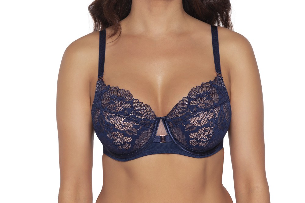Бюстгальтер 1937 выполнен на основе модели 1030, на косточках, чашки шитые, нижняя часть на тонком поролоне телесного цвета, внутри проложена хлопковым трикотажем, снаружи из темно-синего гипюра с цветочным рисунком, верхняя часть чашки из гипюра и телесной сетки, пояс из плотной стабилизирующей сетки, бретельки не отстгиваются, регулируются по длине, фурнитура цвета меди. Косточки декорированы атласной лентой. На спине застжка на удлинитель, количество крючков в ряду застжки увеличивается пропорционально размеру бюстгальтера. Бюстгальтер идеально сочетается с трусиками арт. 1936, 1937, 1938.1937 PU бюст (т-син)