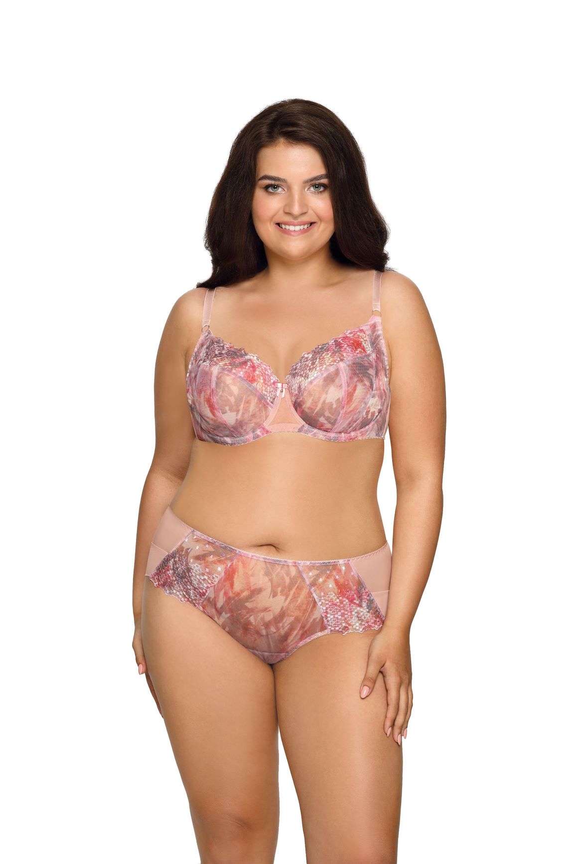 Трусики бразильяна А 1940 из эластичной сетки цвета пудры, спереди вставка из сетки с принтом акварель с вышивкой, продублированная розовым трикотажем из 100 хлопка. Трусики идеально комплектуются с бюстгальтером арт. 1940.