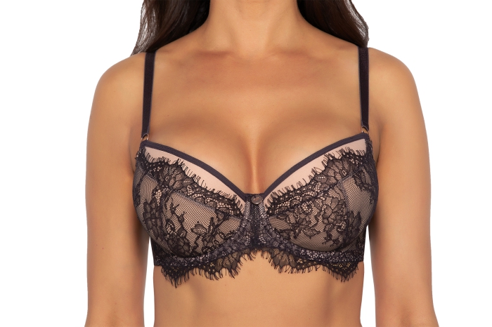 Бюстгальтер 2007 выполнен на основе модели 1638 в цвете , на косточках, чашки шитые на тонком поролоне телесного цвета, со съмными вкладышами пуш-ап, внутренняя сторона проложена хлопковым трикотажем, внешняя покрыта кружевом с цветочным орнаментом с кокетливыми ресничками. Пояс бюстгальтера из телесной и цветной сетки, декорирован кружевом. Бретельки не съмные, регулируются по длине. На спине застжка-удлинитель на крючках, фурнитура металлическая цвета меди. Бюстгальтер идеально сочетается с трусиками 2007, 2008.2007 U push-up бюст (шокол)