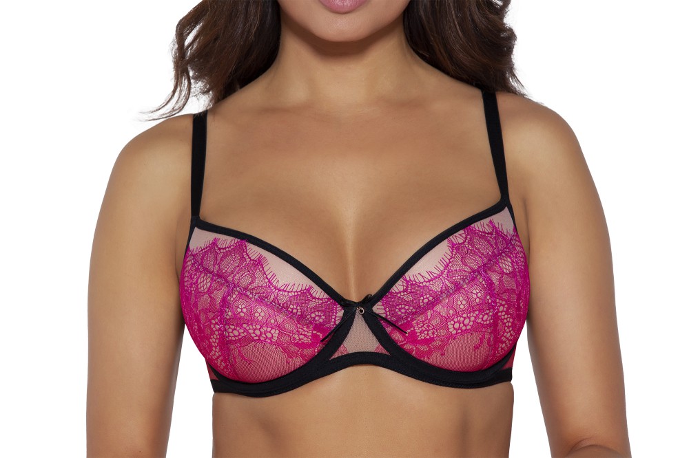 Бюстгальтер 2031 выполнен на основе модели 1638, на косточках, чашки шитые на тонком поролоне телесного цвета, со съмными вкладышами пуш-ап, внутренняя сторона проложена хлопковым трикотажем, внешняя покрыта ярко-розовым кружевом с цветочным орнаментом с кокетливыми ресничками. Пояс бюстгальтера из телесной сетки. Бретельки не съмные, регулируются по длине. На спине застжка-удлинитель на крючках, фурнитура металлическая цвета меди. Резинки, бретели, окантовка косточек контрастного черного цвета. Бюстгальтер идеально сочетается с трусиками 2031, 2032, 2033.2031 U push-up бюст