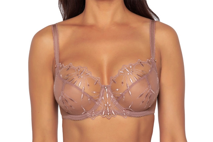 Бюстгальтер 2035 в цвете выполнен с шитыми мягкими чашками на косточках, из сетки с вышивкой, пояс из эластичного сетчатого полотна. Бретельки регулируются по длине, не отстгиваются. На спине застжка на удлинитель, количество крючков в ряду застжки увеличивается пропорционально размеру бюстгальтера. Фурнитура металлическая цвета меди. Бюстгальтер идеально сочетается с трусиками из коллекции 2035.
