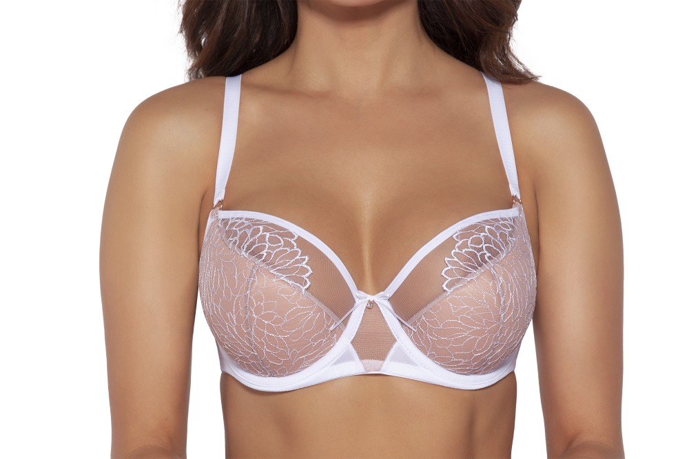 Бюстгальтер А 2036 выполнен на основе модели 925, на косточках, чашки шитые, нижняя часть на тонком поролоне телесного цвета, внутренняя сторона прошита хлопковым трикотажем, внешняя и верхняя часть чашки из телесной сетки с цветочной вышивкой белой нитью. Бретельки не отстгиваются, регулируются по длине, на спине застжка - удлинитель на крючках, фурнитура металлическая цвета меди. Пояс из белой стабилизирующей сетки. Бюстгальтер идеально комплектуется трусиками арт. 2036, 2037, 2038.