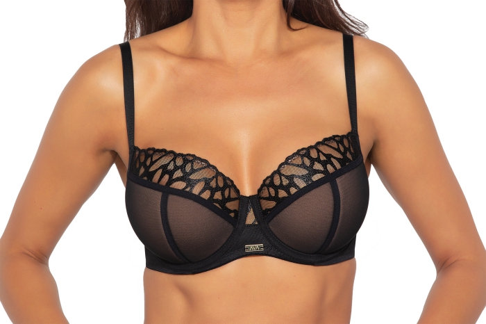 Бюстгальтер 2056 выполнен на основе модели 1030 на косточках, чашки шитые, нижняя часть на тонком поролоне телесного цвета, внутри проложена хлопковым трикотажем, снаружи из черной сетки, верхняя часть чашки из черной сетки с вышивокй черной нитью, напоминающей фактуру крыльев бабочки, армирована силиконовой лентой. Бретельки не отстгиваются, регулируются по длине, фурнитура цвета желтого золота, пояс из эластичного сетчатого полотна разной степени плотности. На спине застжка на удлинитель, количество крючков в ряду застжки увеличивается пропорционально размеру бюстгальтера. Бюстгальтер идеально сочетается с трусиками арт. 2055, 2056, 2058.2056 PU бюст
