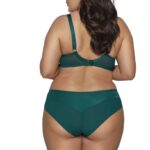 Комфортный бюстгальтер арт. 2087 выполнен в цвете Изумруд с шитыми чашками, на косточках, нижняя часть чашек на тонком поролоне телесного цвета. Нежный тюль на чашках, расшитый блестящей нитью замысловатым цветочным узором, изящно покрывает круглый бюст, дополнительно подчеркнутый изумрудной окантовкой. Пояс из эластичной микрофибры продублирован сетчатым полотном. Бретельки регулируются по длине, не отсегиваются, на спине застжка на удлинитель на 2 или 3 крючка, фурнитура металлическая с цветным покрытием. Бюстгальтер идеально сочетается с трусиками арт. 2087, 2088.