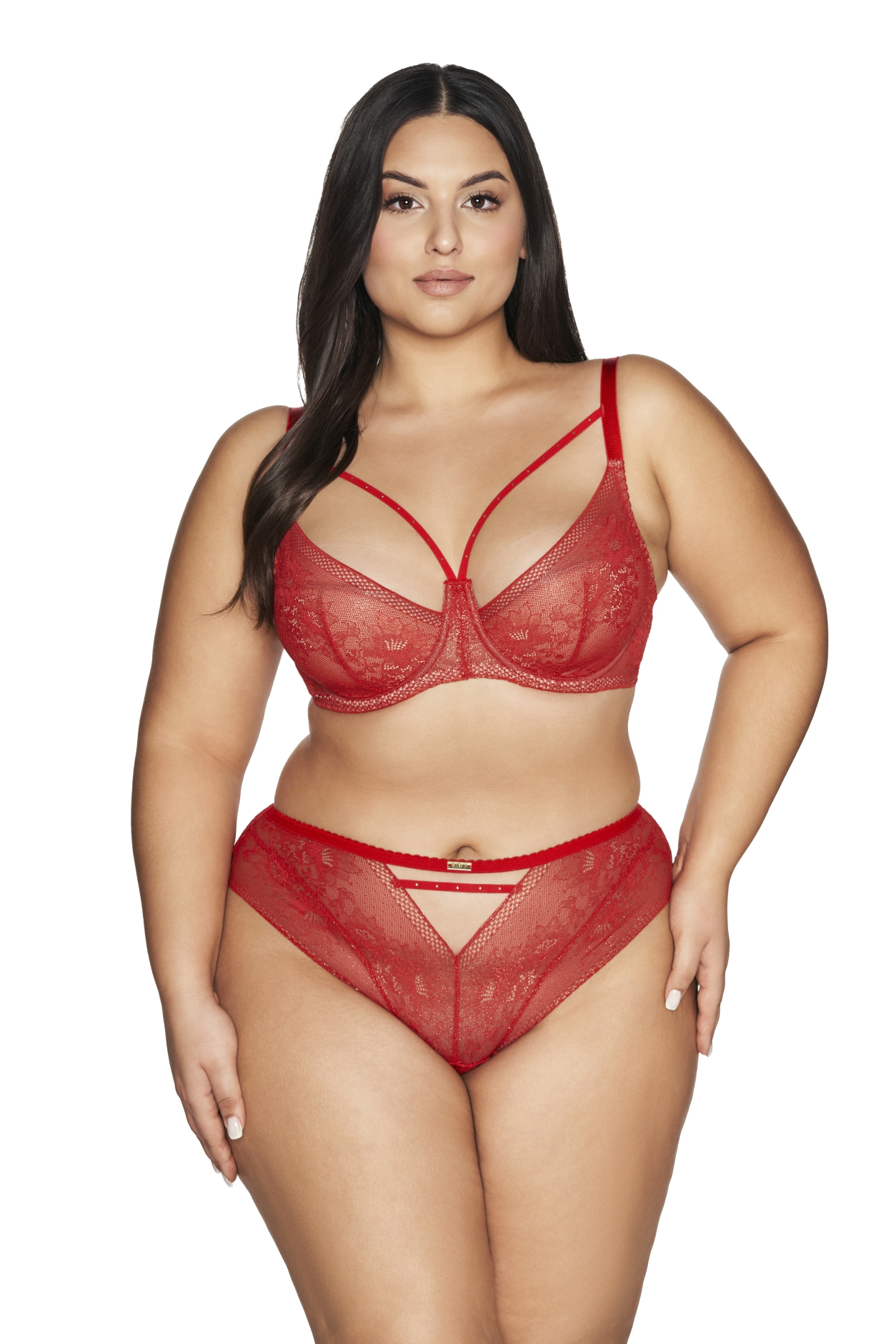 Бюстгальтер А 2127 выполнен на основе бюста 1030 на косточках, чашки шитые, нижняя часть на тонком поролоне телесного цвета, верхняя из телесной сетки, сложенной вдвое. Чашечки идеального кроя красиво моделируют бюст, деликатно прикрывая соблазнительные, женственные формы, огненно-красное кружево, присыпанное золотой пылью, подчеркивает соблазнительно круглый вырез, а причудливые тонкие несъемные бретели с кристаллами в вырезе придают чувственный характер. Пояс кружевной продублирован телесной сеткой. Бретели не отсегиваются, регулируются по длине, фурнитура металлическая цвета розового золота. На спине застежка-удлинитель на 2 крючка. Бюстгальтер идеально комплектуется трусиками арт. 2127, 2128, 2252.2127 PU бюст