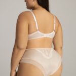 Бюстгальтер А 2147 выполнен на основе модели 1030 в цвете зефир, на косточках, чашки шитые, нижняя часть на тонком поролоне, внутренняя сторона прошита хлопковым трикотажем, внешняя часть чашки из кружева с ресничками, верхняя часть чашки из телесной сетки, сложенной вдвое. Бретельки не отстгиваются, регулируются по длине, на спине застжка - удлинитель на 2 и 3 крючках, фурнитура металлическая цвета меди. Пояс из стабилизирующей сетки с кружева, продублированного сеткой. Нежное цветочное кружево цвета сладкого зефира, поднимающееся вверх по груди, и телесный тюль в верхней части чашек, придают бюстгальтеру романтическое очарование. Бюстгальтер идеально комплектуется трусиками арт. 2147.2147 PU Maxi бюст