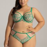 Трусики бразильяна А 2161 выполнены в цвете зелный спереди из чувственного тюля, богато расшитого весенними листьями, спинка из трикотажа и сетки, сложенной вдвое, с -образной вставкой из сетки с вышивкой. Ластовица проложена 100 хлопком телесного цвета. Трусики идеально комплектуются с бюстгальтером арт. 2160, 2161.