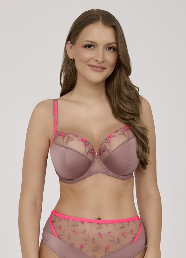 Бюстгальтер А 2217 в цвете Мокко-розовый выполнен на основе бюста 1030 на косточках, чашки шитые, нижняя часть на тонком поролоне, внутренняя сторона прошита хлопковым трикотажем, верхняя часть чашки из сетки, расшитой цветами, внешняя сторона из гладкая из микрофибры. Бретельки не отстгиваются, регулируются по длине, на спине застжка - удлинитель на 2 или 3 крючка, фурнитура металлическая цвета желтого золота. Пояс из стабилизирующей сетки. Прозрачный тюль, расшитый мелкими, насыщенно-розовыми цветами, добавляет свежести и легкости, а контрастные бретельки и отделка добавляют модный и яркий штрих. Бюстгальтер идеально комплектуется трусиками арт. 2217, 2218.2217 PU Maxi бюст