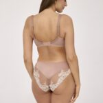 Бюстгальтер 2227 в цвете макиато выполнен на основе бюста 1396, на косточках, чашки мягкие, шитые из сетки и кружева с цветочным кремовым узором, не сшитыми между собой, верхняя часть чашки из сетки, сложенной вдвое, пояс из эластичного сетчатого полотна, бретельки не отстгиваются, регулируются по длине. На спине застжка на удлинитель, количество крючков в ряду застжки увеличивается пропорционально размеру бюстгальтера от 2 до 3, фурнитура металлическая цвета розового золота. Легкие кружевные вставки на фоне теплого оттенка макиато создают изысканный контраст, пленяющий элегантностью и вневременным стилем. Бюстгальтер идеально сочетается с трусиками арт. 2225, 2226, 2227.2227 M Maxi бюст