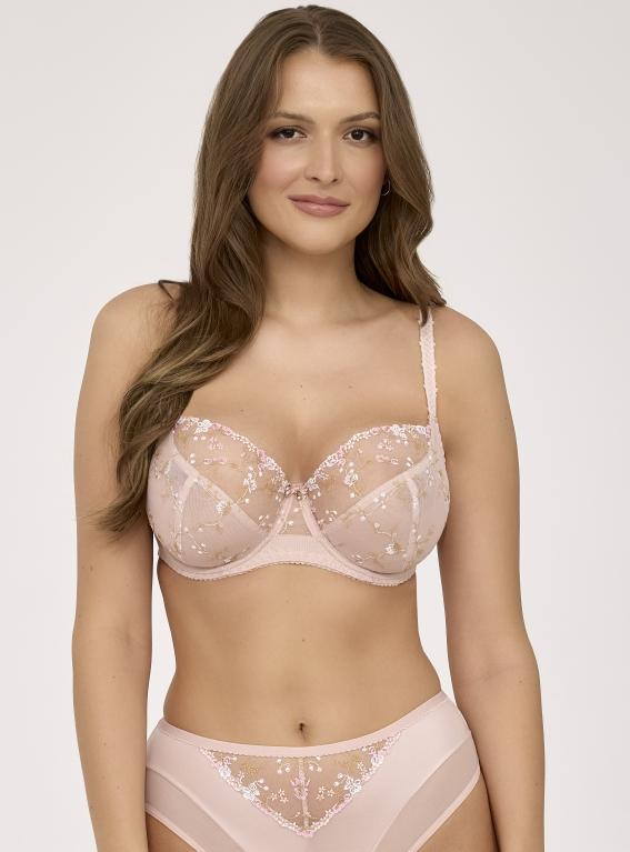 Бюстгальтер 2228 в цвете позолоченный лепесток выполнен на основе бюста 1396 с шитыми из двух слоев нежного тюля мягкими прозрачными чашками на косточках, чашки украшены вышивкой, вдохновленной цветочными веточками в пастельных оттенках розового и белого. Бретельки регулируются по длине, не отстгиваются. Пояс из стабилизирующей сетки. На спине застжка на удлинитель, количество крючков в ряду застжки увеличивается пропорционально размеру бюстгальтера. Фурнитура металлическая цвета желтого золота. Бюстгальтер идеально сочетается с трусиками из коллекции 2228.2228 M Maxi бюст