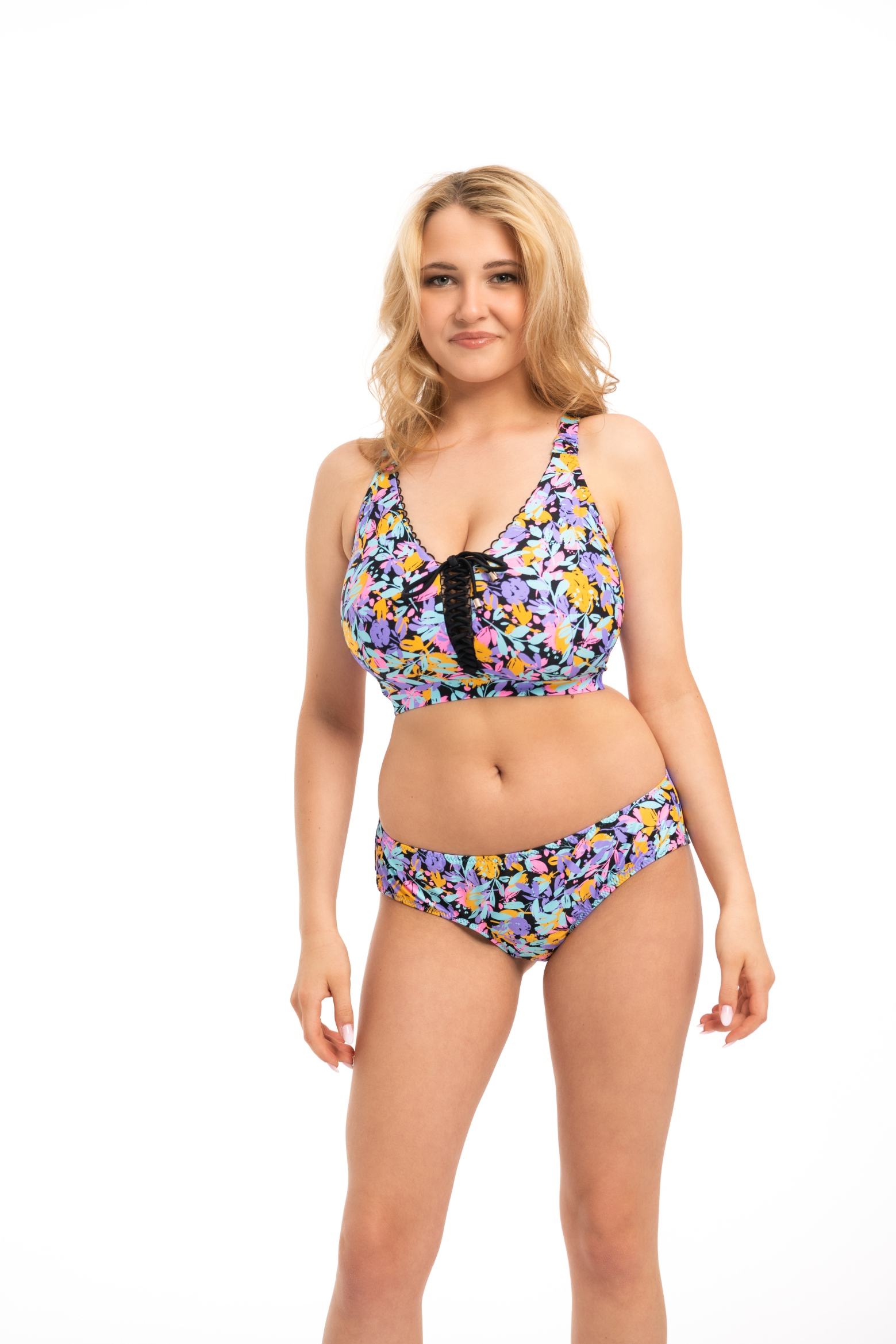 Бюст 2407 выполнен из ткани с растительным принтом, чашки мягкие, без косточек, продублированы сеткой, с дополнительными боковыми поддержками, с дополнительной корректирующей сеткой по бокам чашек, между чашек шнуровка, бретельки регулируются по длине, на спине застжка, фурнитура металлическая цвета хрома, пояс продублирован стабилизирующей сеткой.2407 M бюст пляжный