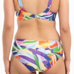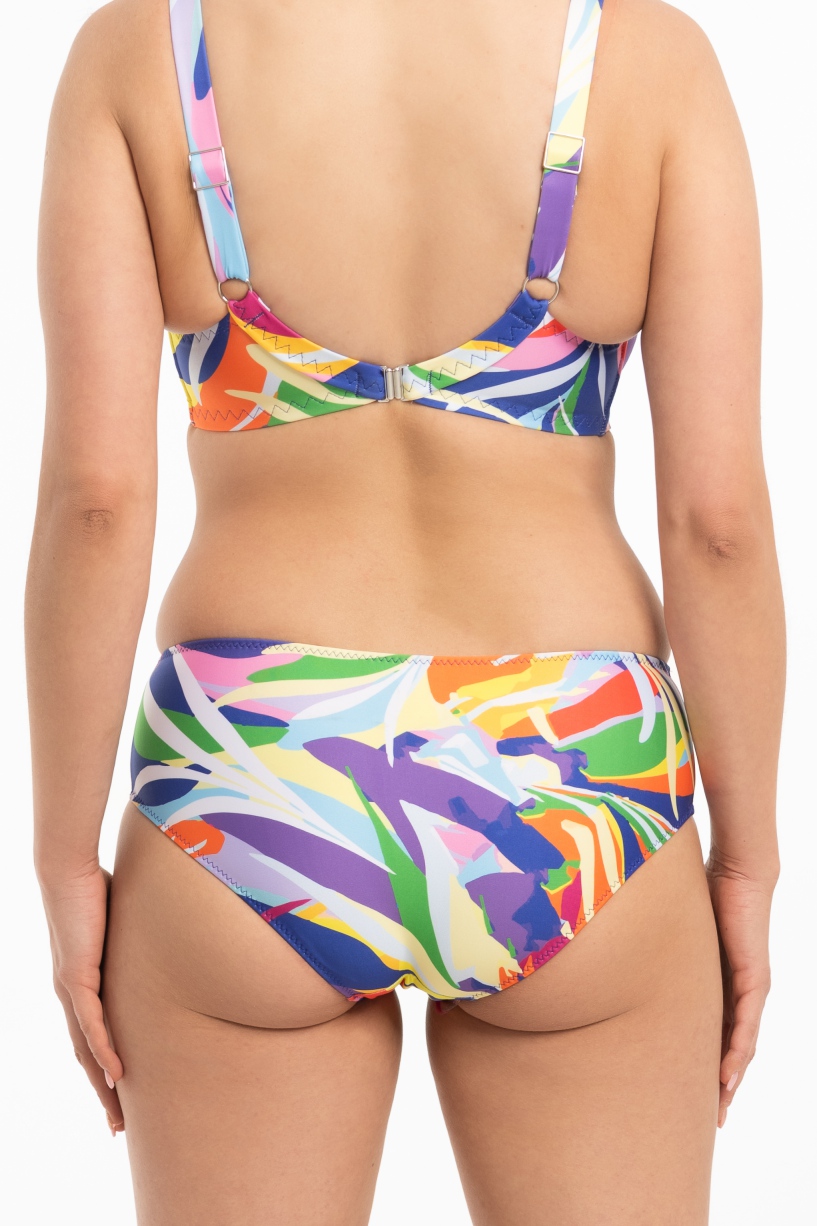 Бюст 2428 выполнен из ткани с абстрактным принтом, чашки мягкие, с косточками, продублированы сеткой, с дополнительными боковыми поддержками, бретельки регулируются по длине, на спине застжка, фурнитура металлическая, пояс продублирован стабилизирующей сеткой.2428 M бюст пляжный