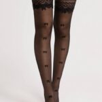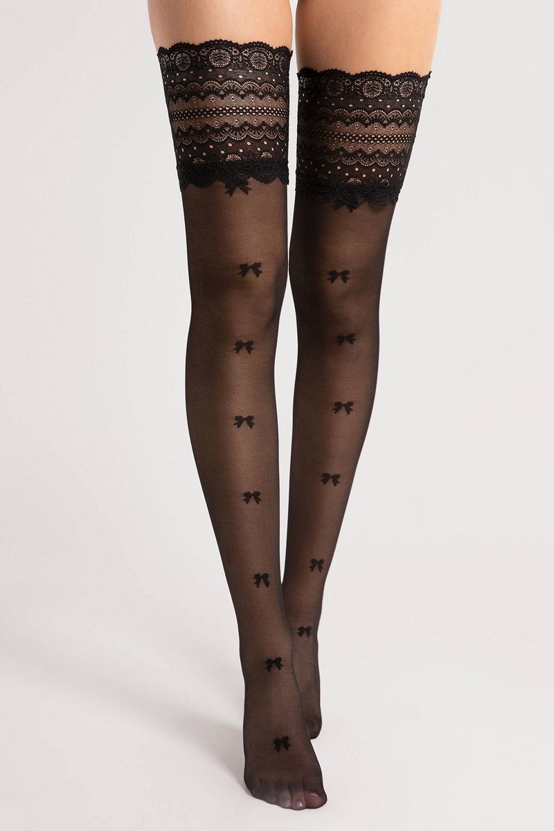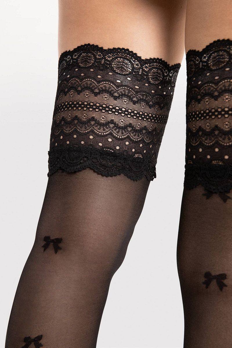 Оригинальные самоподдерживающиеся чулки с черными бантиками. Бантики не останутся незамеченными, выделяя ваши ножки. Верх чулок выполнен из классического кружева с причудливыми декоративными узорами. Самонесущие чулки идеально сидят на ножках благодаря силиконовым полоскам. Женственный узор с эффектным рисунком спереди подчеркнет вашу оригинальность.
