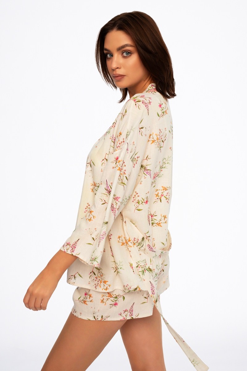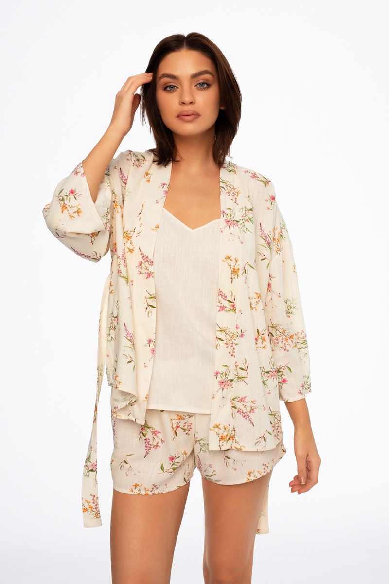 Короткий халат 41225 DARBY от европейского производителя Esotiq. Изделие с поясом, на запахе, с внутренними завязками. Укороченный широкий рукав. В составе ткани содержится хлопок, лен, вискоза.41225 DARBY Халат женский
