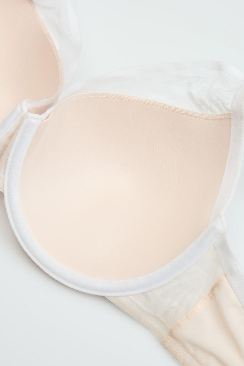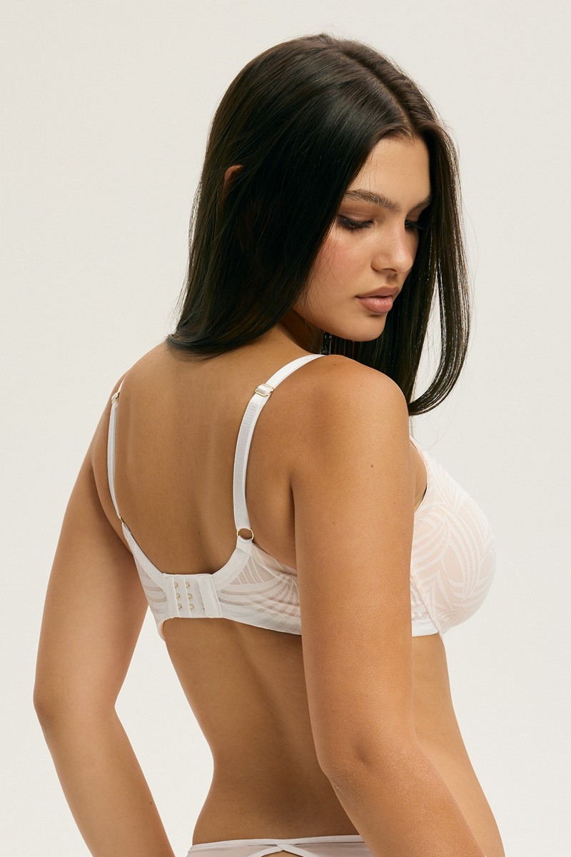 Бюстгальтер построенный на чашке Beautiful, привлекает внимание своей гладкой отделкой и тонкой прозрачностью. Эластичное кружево с геометрическим рисунком. Чашка из тонкого поролона на кости с несъемными регулируемыми бретелями обеспечивает комфорт и стабильность. Золотые детали. Состав: сетка 72% полиамид, 28% эластан; подклад чашки 100% полиэстер.43522 NACRE/01X Бюст