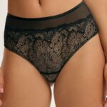 Черные трусы с высокой посадкой Crown. Прозрачная вставка на поясе сочетается с богатым растительным узором, который красиво контрастирует с кожей. Скосы спереди ведут линию к центру и визуально выпячивают бёдра, а скошенный сзади вырез рисует на теле элегантный контур в форме буквы V. Неглубокая вытачка сзади придает образу современный вид и деликатно подчеркивает талию. Насыщенный черный цвет усиливает контраст, благодаря чему деталь становится выразительной и невероятно благородной. Хлопковая ластовица. Состав сетки: 84% полиамид, 16% эластан.