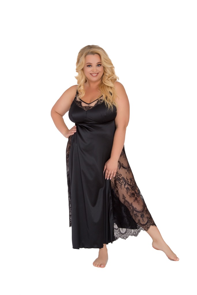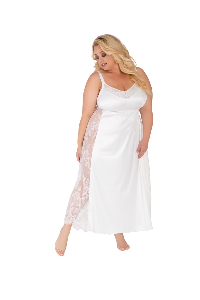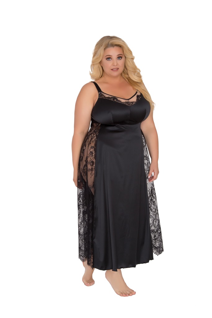 Сорочка атласная арт. 591, подол сорочки из полотна с атласным блеском, по бокам вставки из гипюра с цветочным рисунком, лиф мягкий, украшен кружевом, бретели регулируются по длине, под грудью пришита широкая эластичная резинка.
