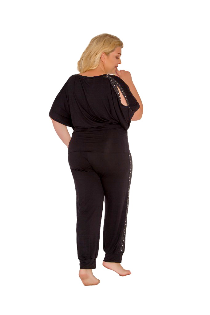 Комплект арт. 596 из вискозного полотна туника с круглым вырезом, рукава короткие, с разрезами на плечах, украшенными металлическими заклепкамибрюки с эластичной резинкой и манжетами, с лампасами с металлическими заклепками.
