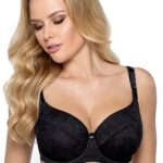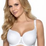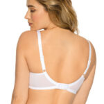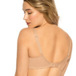 Бюстгальтер 758 выполнен на косточках, чашки шитые на тонком поролоне, внутренняя сторона проложена хлопковым трикотажем, внешняя сторона покрыта кружевным полотном с растительным рисунком, боковая часть чашки удлинена бретелькой, спинка из стабилизирующей сетки. Бретельки не съмные, регулируются по длине. На спине застжка на удлинитель, фурнитура металлическая крашеная. Бюстгальтер идеально сочетается с трусиками 758 .758 Micaela U бюст