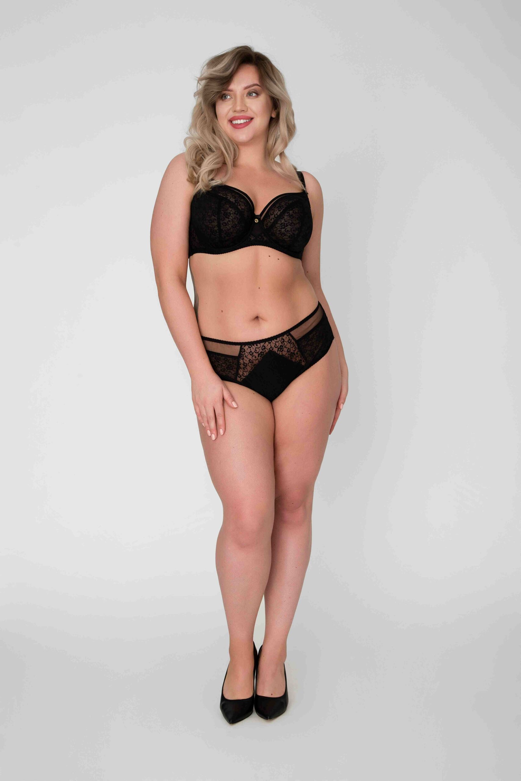 Бюстгальтер -117 выполнен на косточках, с боковыми поддержками для предотвращения скатывания пояса, чашки мягкие шитые из гипюра с цветочным рисунком, с Т-образным швом, продублированы черной сеткой. Спинка из плотной стабилизирующей сетки. Бретельки пришиты, регулируются по длине, на спине застжка - удлинитель на крючках, фурнитура металлическая крашеная.A-117 M бюст