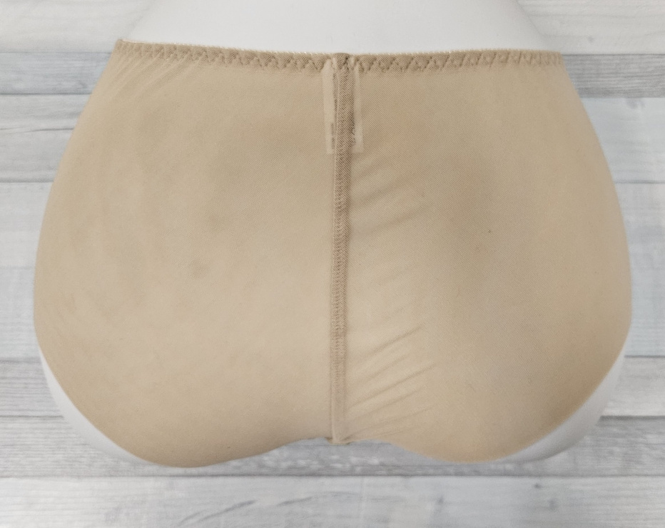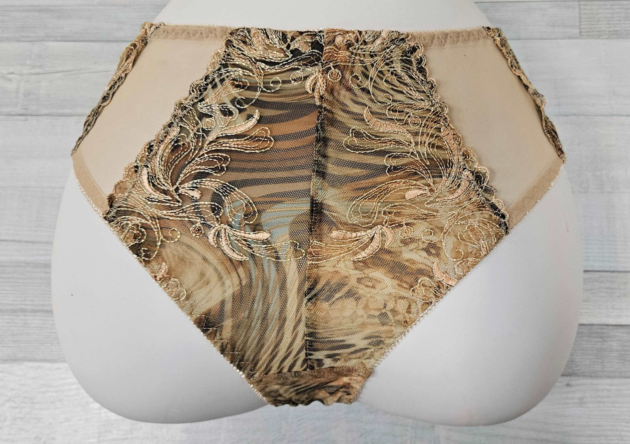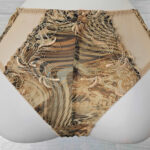 Женские трусики -64 выполнены из сетки с принтом с вышивкой бежевой нитью и люрексом, спинка из сложенной вдвое телесной сетки, ластовица проложена 100 хлопком. Идеальный вариант для повседневной носки, сочетаются с бюстом -64.