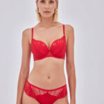 Бюстгальтер - выполнен на косточках, с дополнительными боковыми поддержками, чашки шитые на тонком поролоне красного цвета, со съмными пуш-ап вкладышами, внешняя сторона из кружева с растительным орнаментом. Спинка из двух слоев сетки, декорирована кружевом. Бретельки не отстгиваются, регулируются по длине. На спине застжка на удлинитель, фурнитура металлическая цвета меди. Косточки на чашках декорированы атласной тесьмой. Бюстгальтер идеально сочетается с трусиками .Adore P-UP бюст