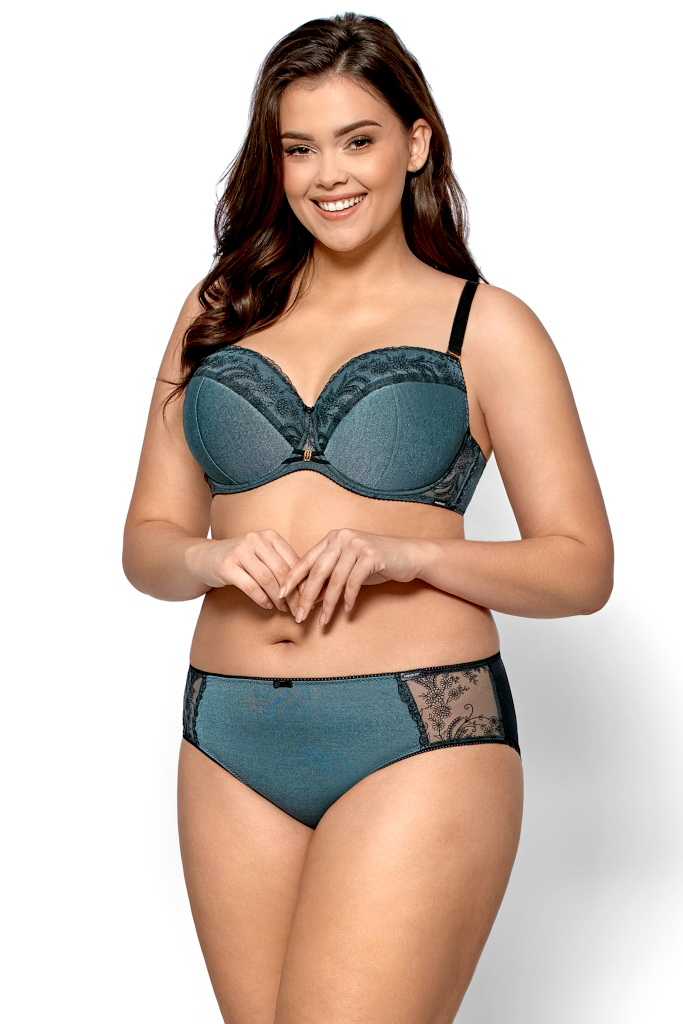 Бюстгальтер из коллекции выполнен в модном цвете, на косточках, с дополнительными боковыми поддержками, чашки шитые, на тонком поролоне, внутри чашечки проложены хлопковым трикотажем, есть кармашки со съмными вкладышами, снаружи верхняя часть чашки покрыта сеткой с вышивкой. Бретельки не отстгиваются, регулируются по длине. На спине застжка на удлинитель, количество крючков в ряду застжки увеличивается пропорционально размеру бюстгальтера. Бюстгальтер идеально сочетается с трусиками .Agnes U бюст