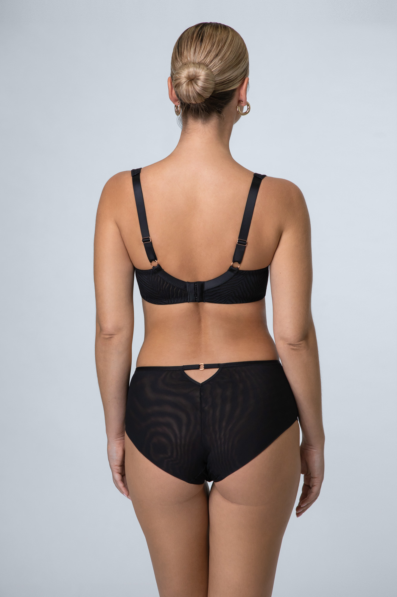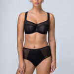 Трусики слип с завышенной талией из коллекции выполнены спереди из черного эластичного кружевного полотна, продублированы сеткой в тон, спинка из сетки, сложенной вдвое, с -образным вырезом, фурнитура металлическая цвета меди. Ластовица из 100 хлопка черного цвета. Идеально сочетаются с бюстгальтерами , .