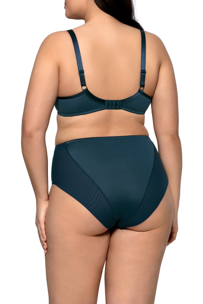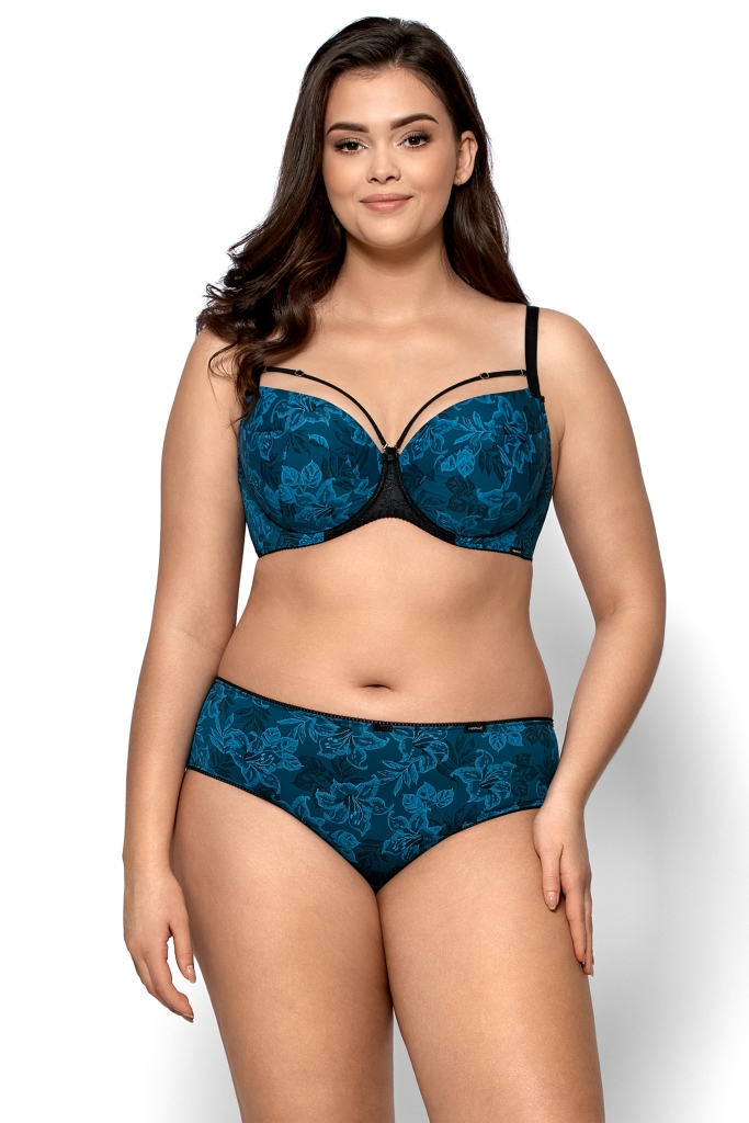 Бюстгальтер из коллекции выполнен в модном цвете с цветочным принтом, на косточках, с дополнительными боковыми поддержками, чашки шитые, на тонком поролоне, со съмными пуш-ап вкладышами, внутри чашечки проложены хлопковым трикотажем, внешняя сторона гладкая, в зоне декольте съмные тонкие декоративные бретели. Бретельки не отстгиваются, регулируются по длине. На спине застжка на удлинитель, количество крючков в ряду застжки увеличивается пропорционально размеру бюстгальтера. Бюстгальтер идеально сочетается с трусиками .Angela U бюст