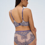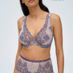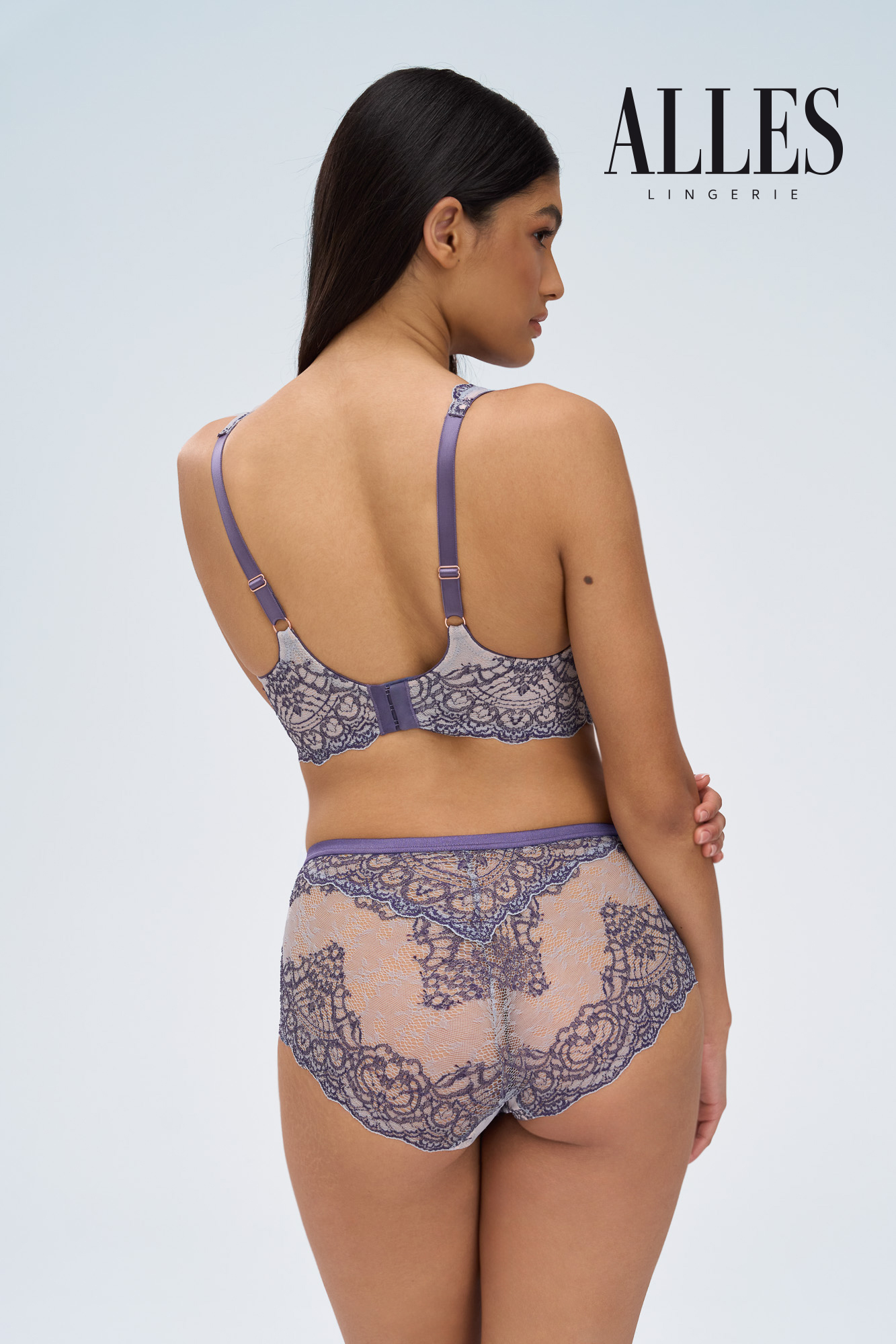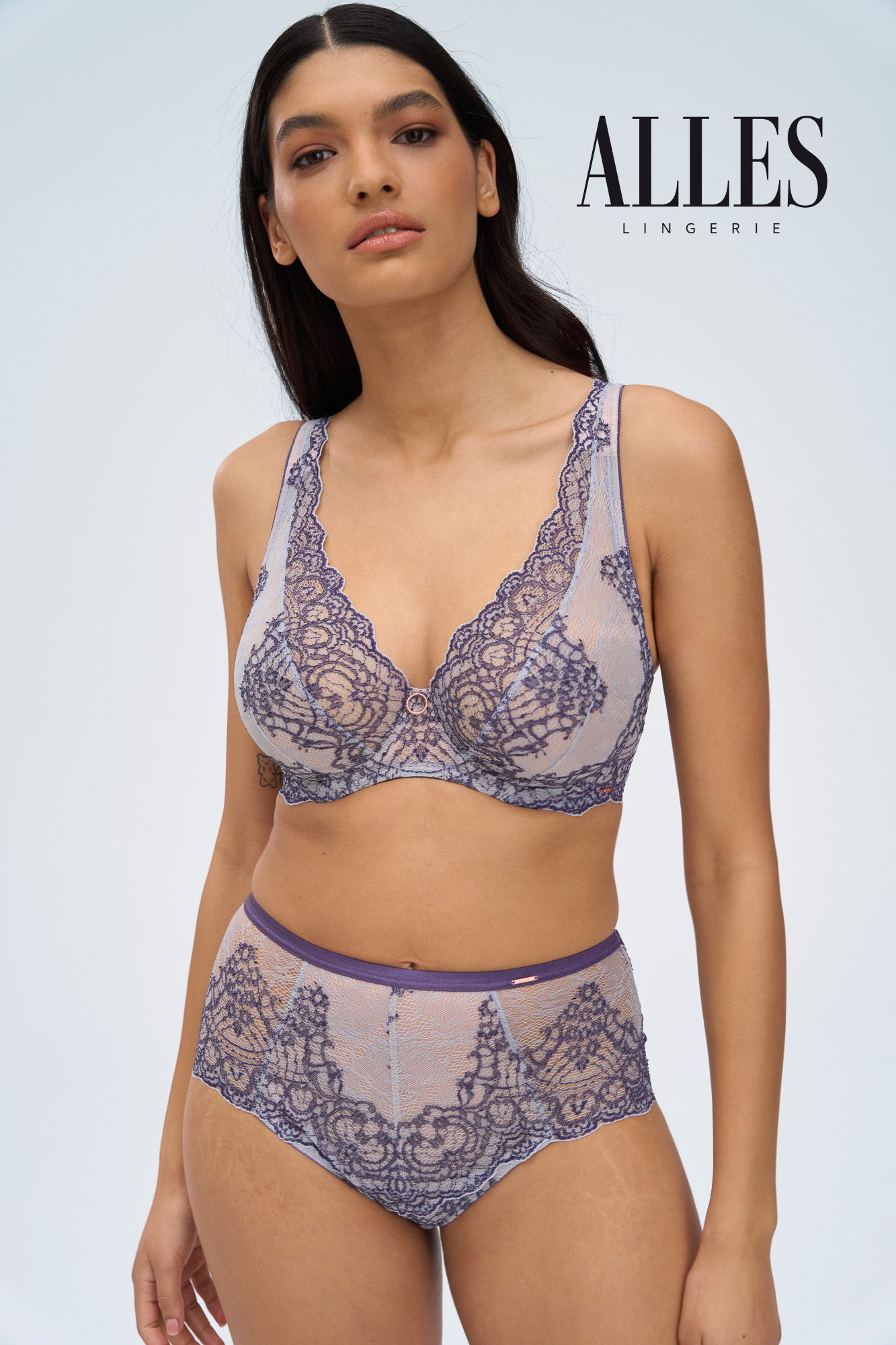 Бюстгальтер бралетт выполнен на основе бюста бралетт с мягкими чашечками на косточках, с дополнительными боковыми поддержками, чашки шитые, из кружева, продублированы телесной сеткой. Широкие бретели с подкладкой из мягкого пеноматериала регулируются по длине, не отстгиваются, спинка кружевная продублирована телесной сеткой. На спине застжка на удлинитель, количество крючков в ряду застжки увеличивается пропорционально размеру бюстгальтера, фурнитура металлическая цвета розового золота. Бюстгальтер идеально сочетается с трусиками . Оттенок ультрафиолета, переливающийся в искусно сотканных нитях, создат гипнотический узор на лгком, почти невесомом фоне изысканного голубого цвета. Этот оттенок, приглушнный морскими полутонами, придат модели благородство и глубину.