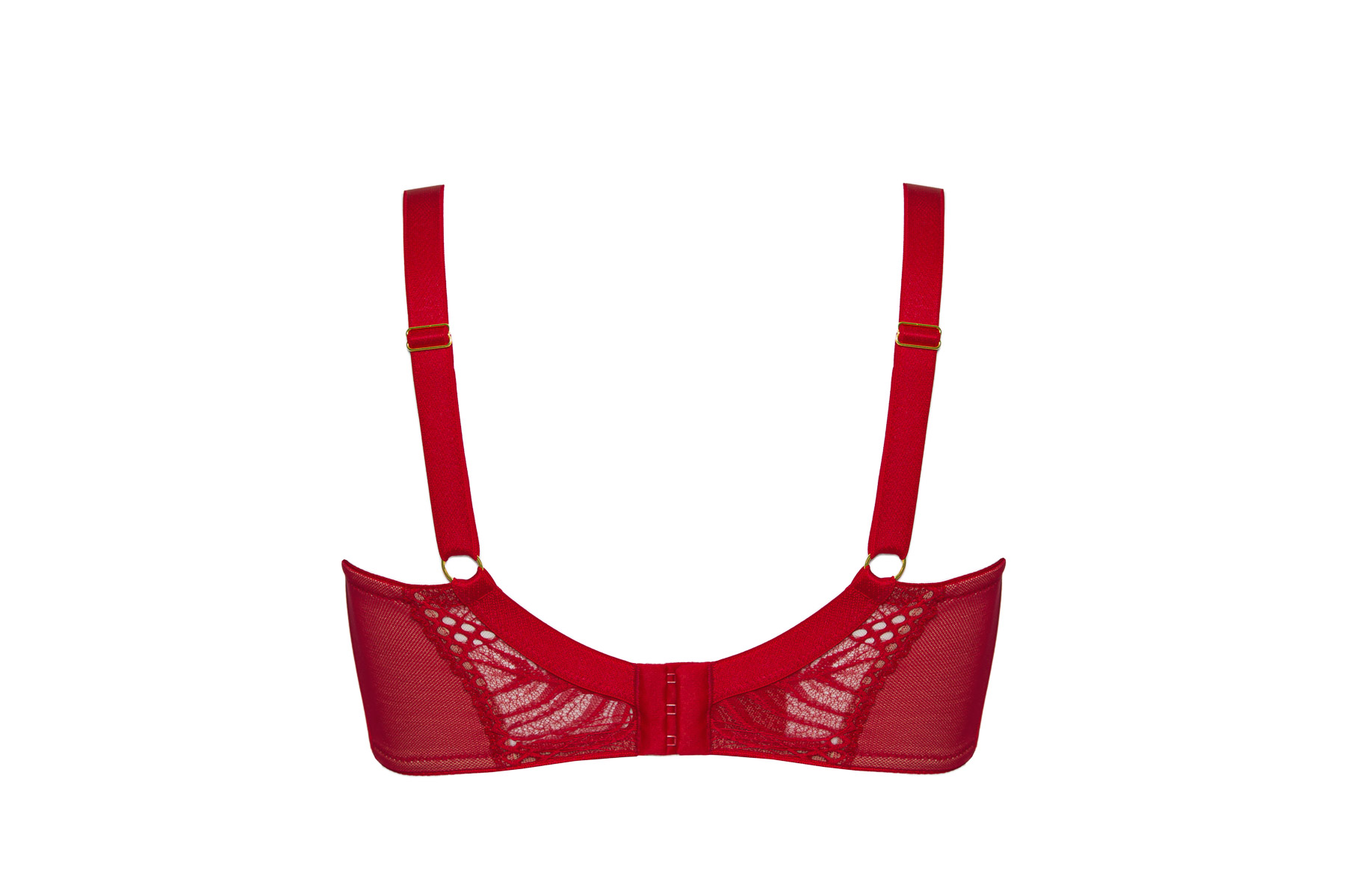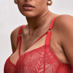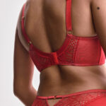 Бюстгальтер выполнен на косточках на каркасах, с дополнительными боковыми поддержками, чашки шитые мягкие, внешняя сторона кружевная, продублированы телесной сеткой, с боковым подкроем. Бретельки не отстгиваются, регулируются по длине. На спине застжка на удлинитель, количество крючков в ряду застжки, увеличивается пропорционально размеру бюстгальтера. Спинка из сетки и кружева продублирована телесной сеткой. В зоне декольте дополнительные тонкие несъемные бретели, регулируются по длине, фурнитура металлическая цвета желтого золота. Бюстгальтер идеально сочетается с трусиками .Beverly M бюст (красн)
