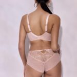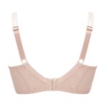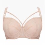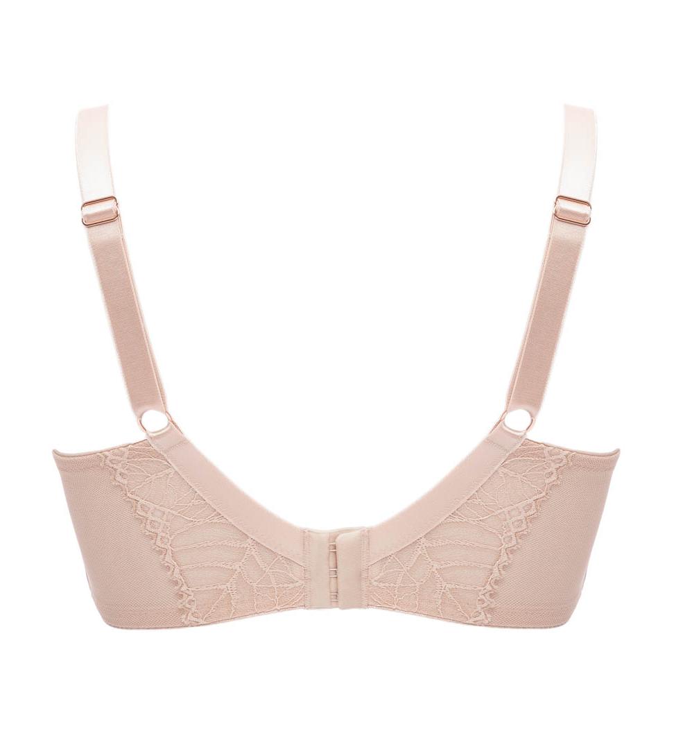 Бюстгальтер выполнен на косточках, с дополнительными боковыми поддержками, чашки шитые мягкие, внешняя сторона кружевная, продублированы телесной сеткой, с боковым подкроем. Спинка из сетки и кружева продублтрована телесной сеткой. Бретельки не отстгиваются, регулируются по длине. На спине застжка на удлинитель, количество крючков в ряду застжки, увеличивается пропорционально размеру бюстгальтера. В зоне декольте дополнительные тонкие съемные бретели, регулируемые по длине, фурнитура металлическая цвета розового золота. Окантовка косточек и боковые поддержки декорированы атласными лентами. Бюстгальтер идеально сочетается с трусиками .Beverly M бюст (телесн)