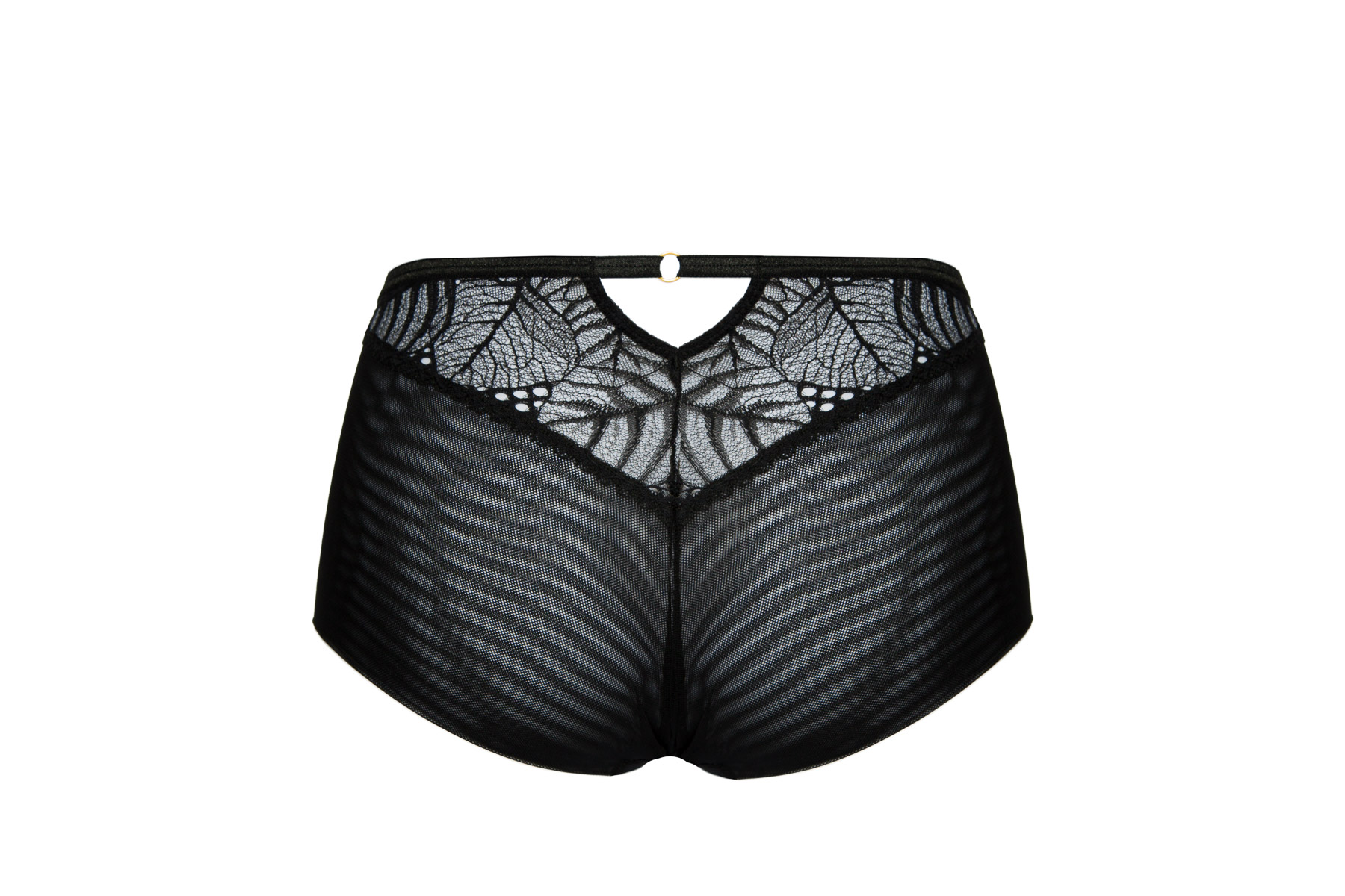 Трусики классические с завышенной линией талии из коллекции выполнены из кружевного полотна и эластичной сетки, на спинке -образный вырез, спереди продублированы черной сеткой. Ластовица проложена 100 хлопком.