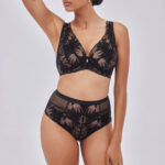 Бюстгальтер бралетт из коллекции выполнен с мягкими чашечками на косточках на каркасах, с дополнительными боковыми поддержками, чашки шитые из роскошного кружева с цветочным рисунком, продублированы неэластичной телесной сеткой. Бретельки регулируются по длине, не отстгиваются. На спине застжка на удлинитель, количество крючков в ряду застжки увеличивается пропорционально размеру бюстгальтера, пояс кружевной продублирован сетчатой тканью телесного цвета. Фурнитура металлическая цвета розового золота. Бюстгальтер идеально сочетается с трусиками из коллекции .Boudoir M бралетт бюст