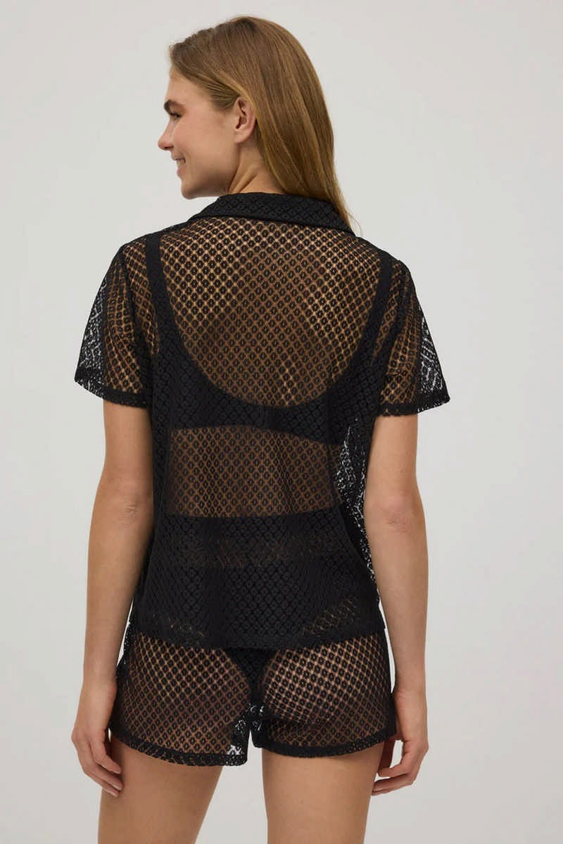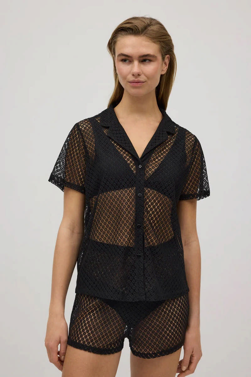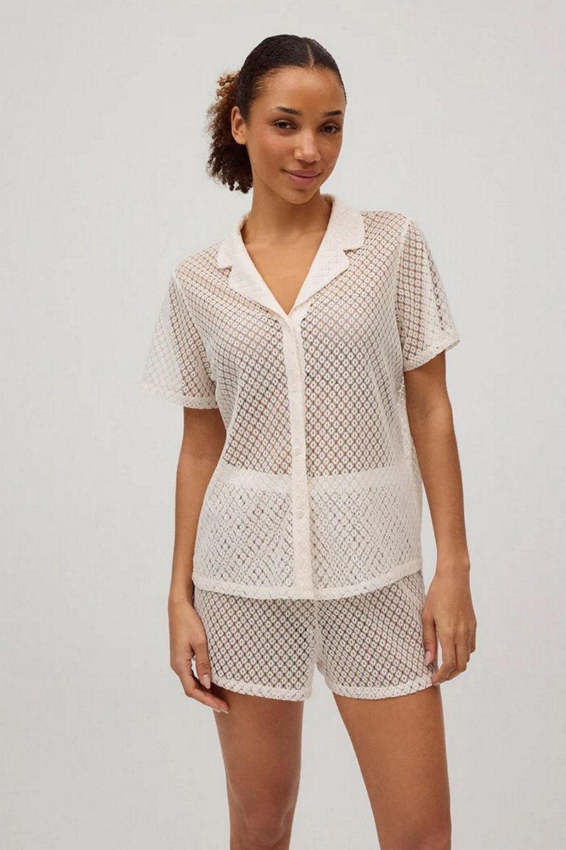 Короткая пляжная рубашка от Ysabel Mora CABO BLANCO 86175. Рубашка на пуговицах, с коротким рукавом и отложным воротником. Полупрозрачная ткань. Подходят шорты арт.86176.