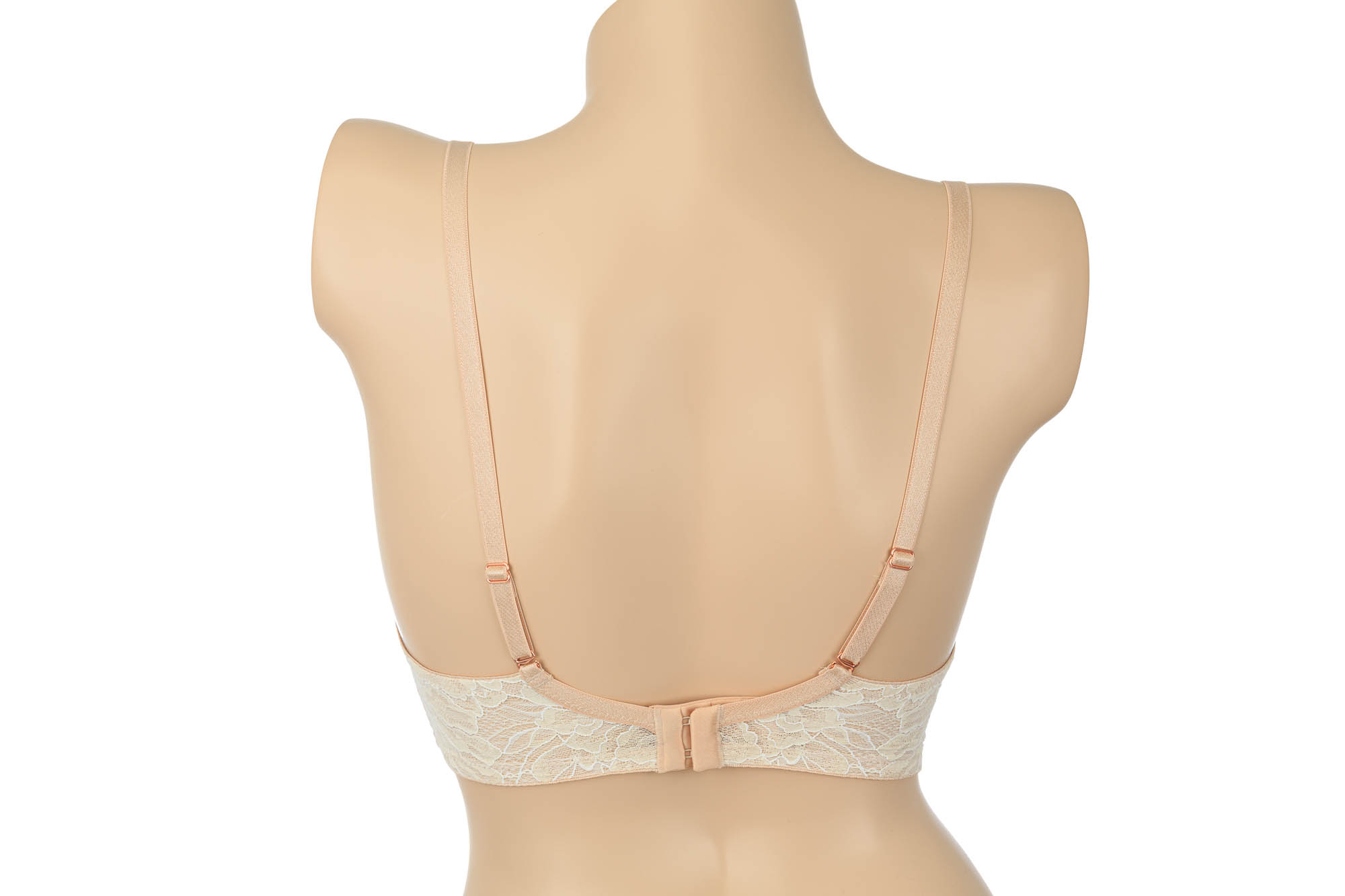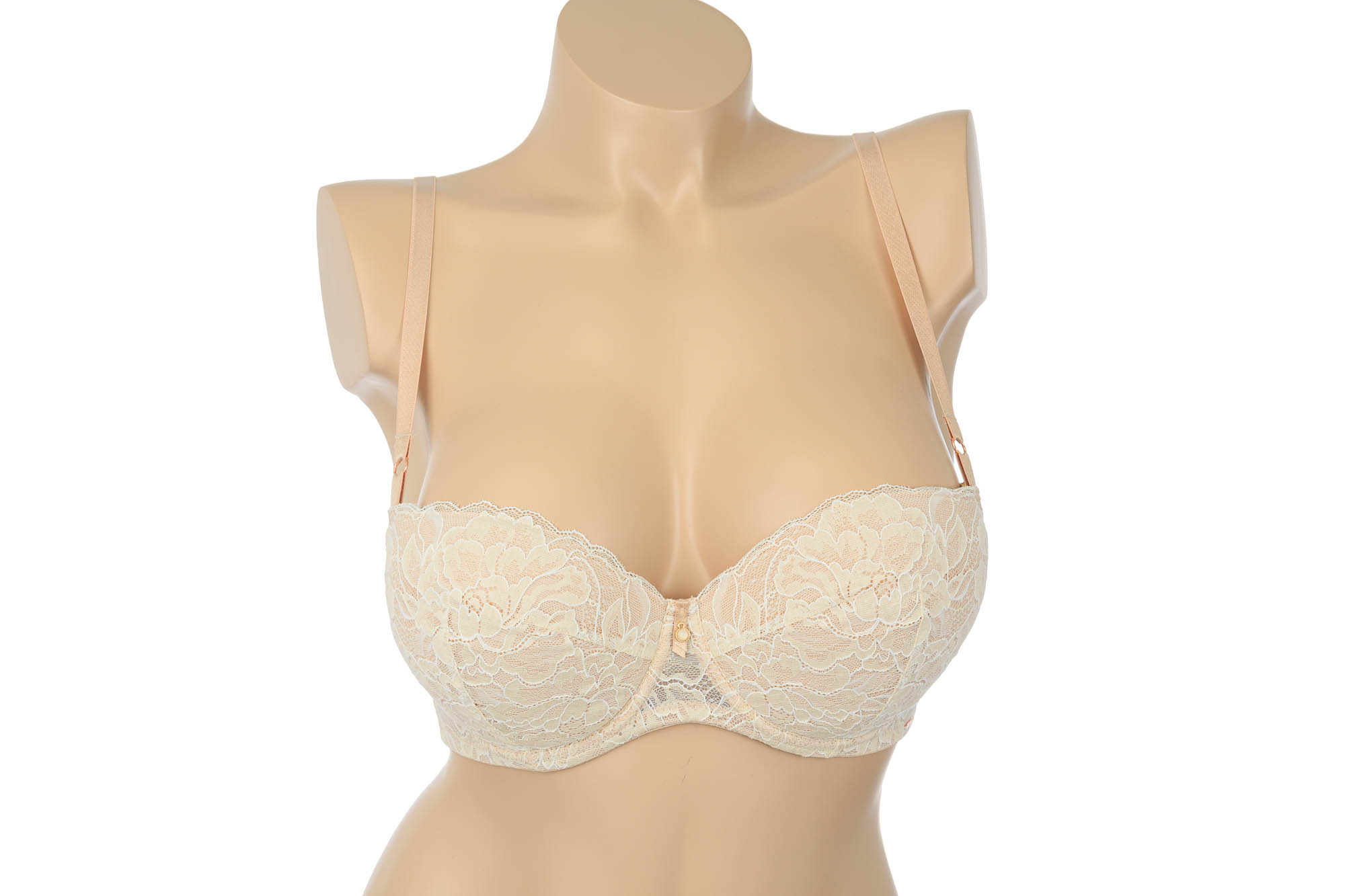 Бюстгальтер / на косточках, с дополнительными боковыми поддержками, чашки шитые на тонком поролоне телесного цвета, со съмными пуш-ап вкладышами, внешняя сторона чашки и спинка кружевные. Бретельки не отстгиваются, регулируются по длине. На спине застжка на удлинитель, количество крючков в ряду застжки, увеличивается пропорционально размеру бюстгальтера, фурнитура цвета меди. Бюстгальтер идеально сочетается с трусиками .