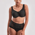 Бюстгальтер выполнен в черном цвете на косточках, с дополнительными боковыми поддержками, чашки шитые из кружевного полотна, чашки и кружевная спинка продублированы сеткой цвета тауп. Бретельки широкие не отстгиваются, регулируются по длине, с тонким поролоном для комфорта. На спине застжка на удлинитель на 3 крючка. Фурнитура металлическая цвета меди. Бюстгальтер идеально сочетается с трусиками .Celeste M big бюст (черн)