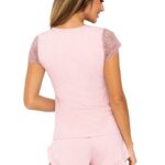 Нежная вискозная пижама CELINE 1/2. В комплекте футболка с V-образным вырезом горловины и кружевными рукавами, и короткие шорты с бантиком и рюшей по нижней кромке. На сайте указан европейский размер! К европейскому размеру +6CELINE 1/2 Пижама женская с шортами