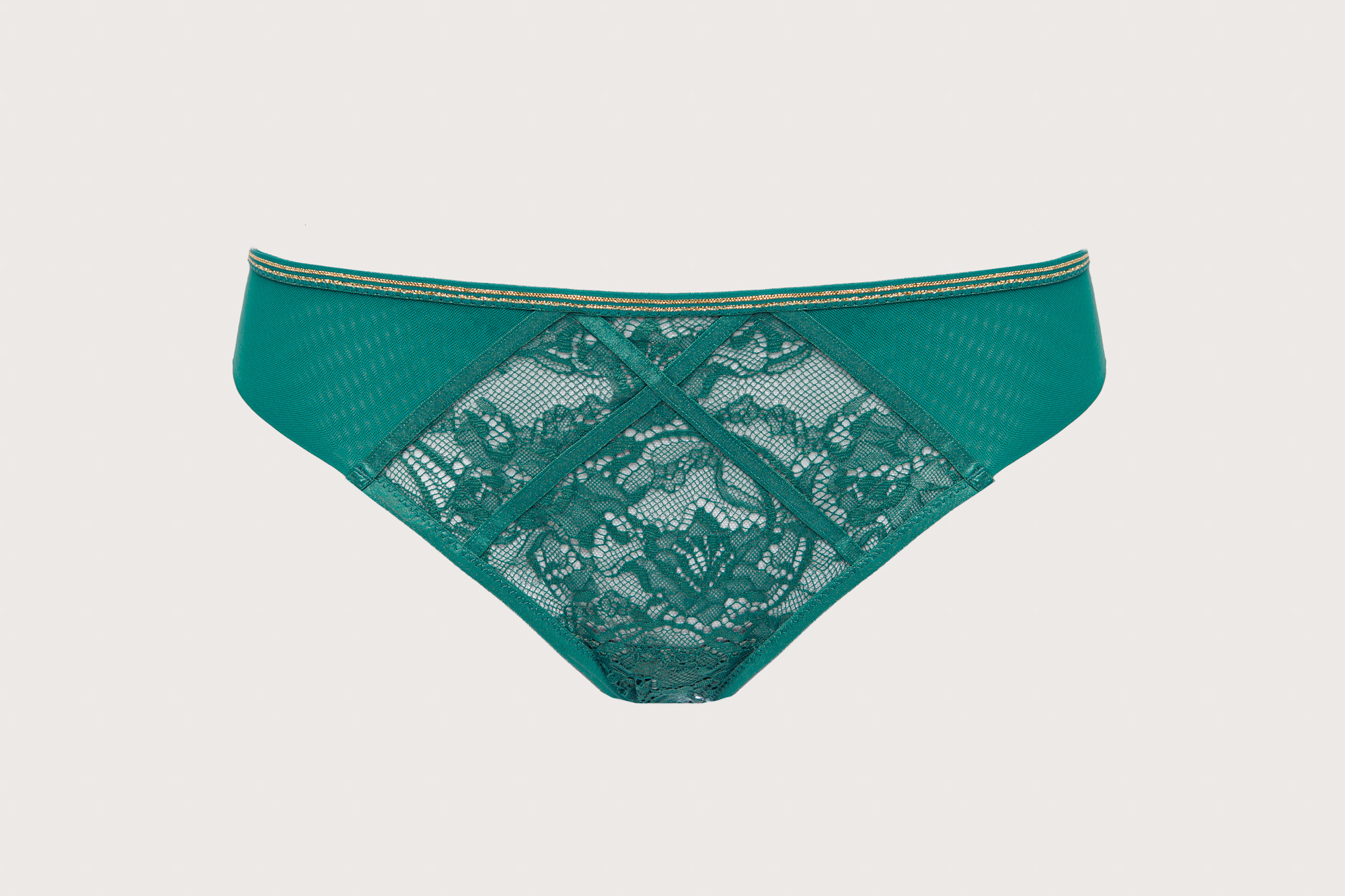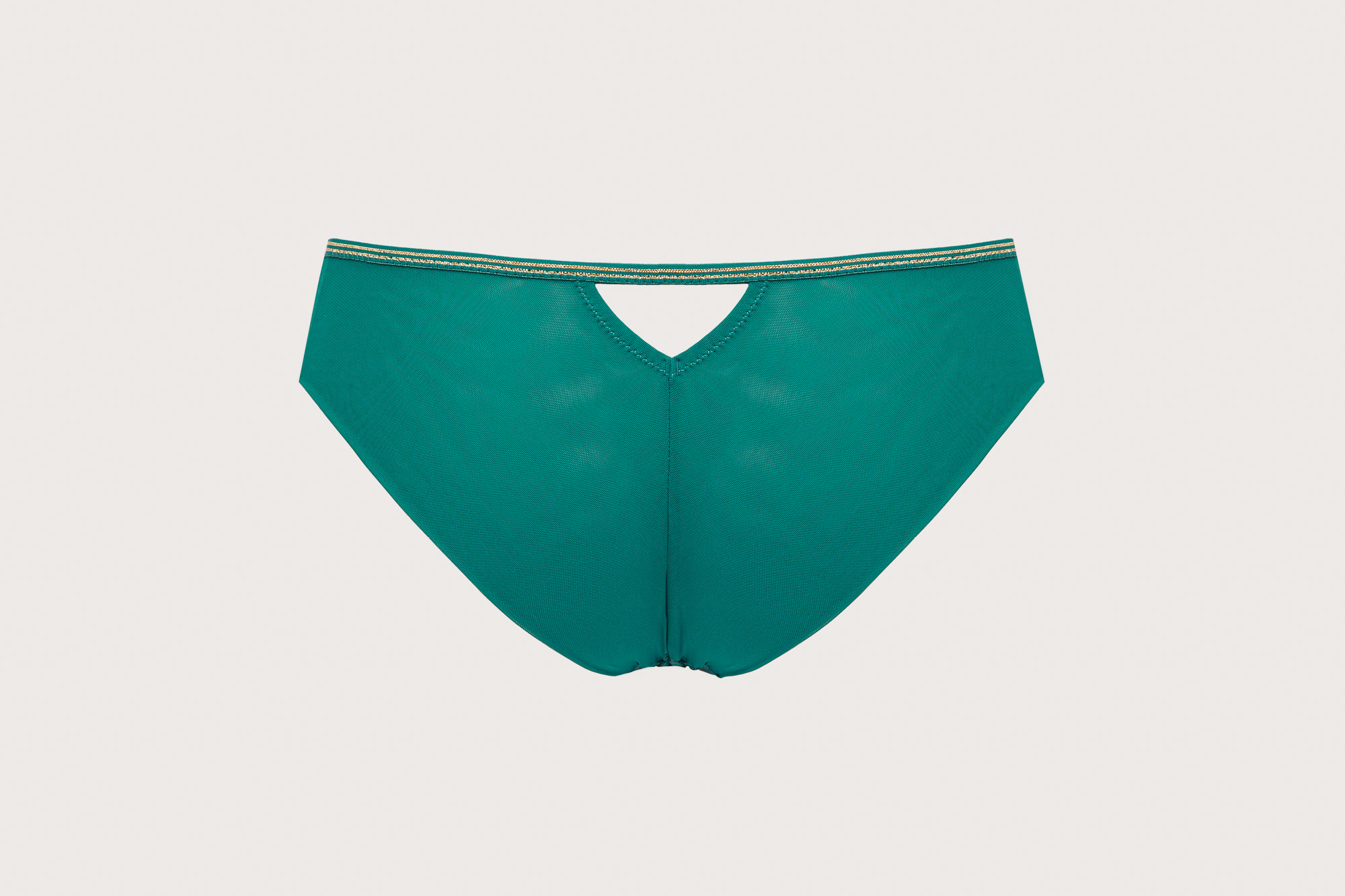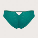 Трусики бразильяна из коллекции выполнены в насыщенном летнем зелном цвете с глубокими голубыми оттенками из кружевного полотна, продублированного телесной сеткой, спинка из сетки, сложенной вдвое, с -образным вырезом. Ластовица проложена 100 хлопком. Золотая люрексовая нить проходит через всю коллекцию, добавляя ей утончнного блеска и благородства.