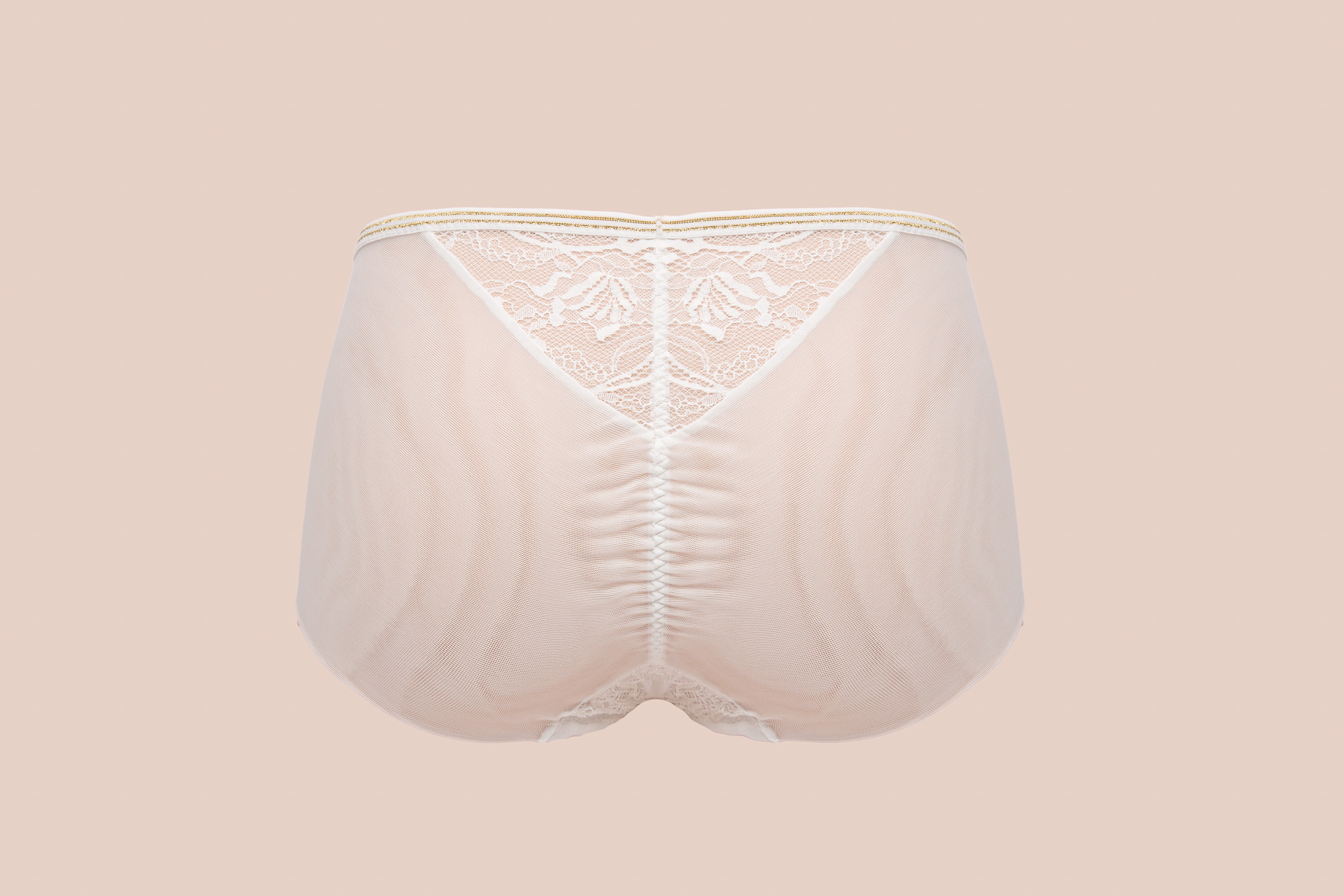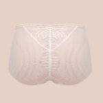 Трусики классические с высокой талией из коллекции выполнены в цвете - из кружевного полотна, продублированного белой сеткой, спинка из сетки, сложенной вдвое, с -образной вставкой кружева, на спинке вертикально присборены. Ластовица проложена 100 хлопком. Золотая люрексовая нить проходит через всю коллекцию, добавляя ей утончнного блеска и благородства.Chiara Gold classic трусы с завышенной талией (белый)